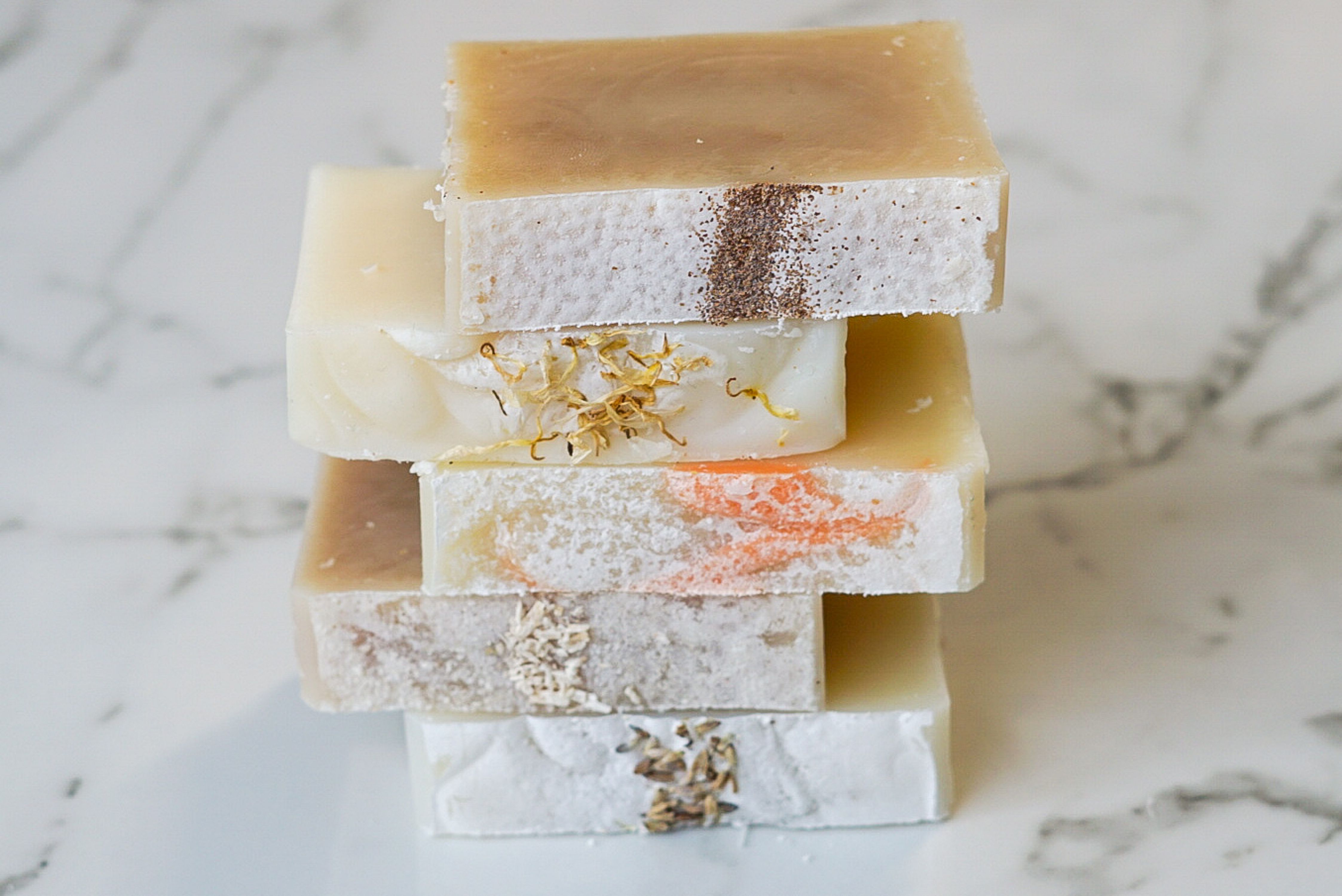 Saponified organic oils of olive, coconut, palm, and shea butter, fragrance, dried coconut or orange peel, lavender or almonds, or other decorations on top.