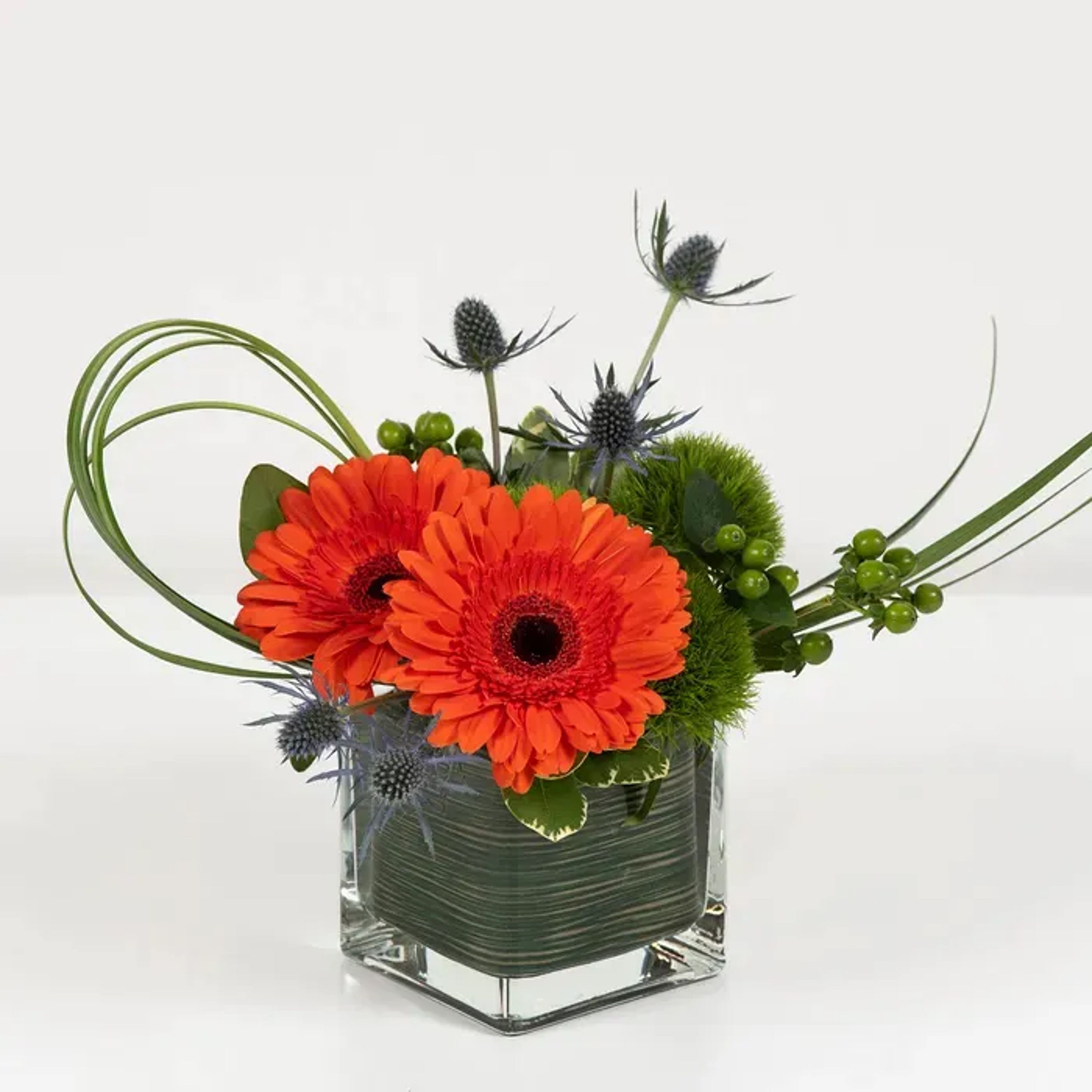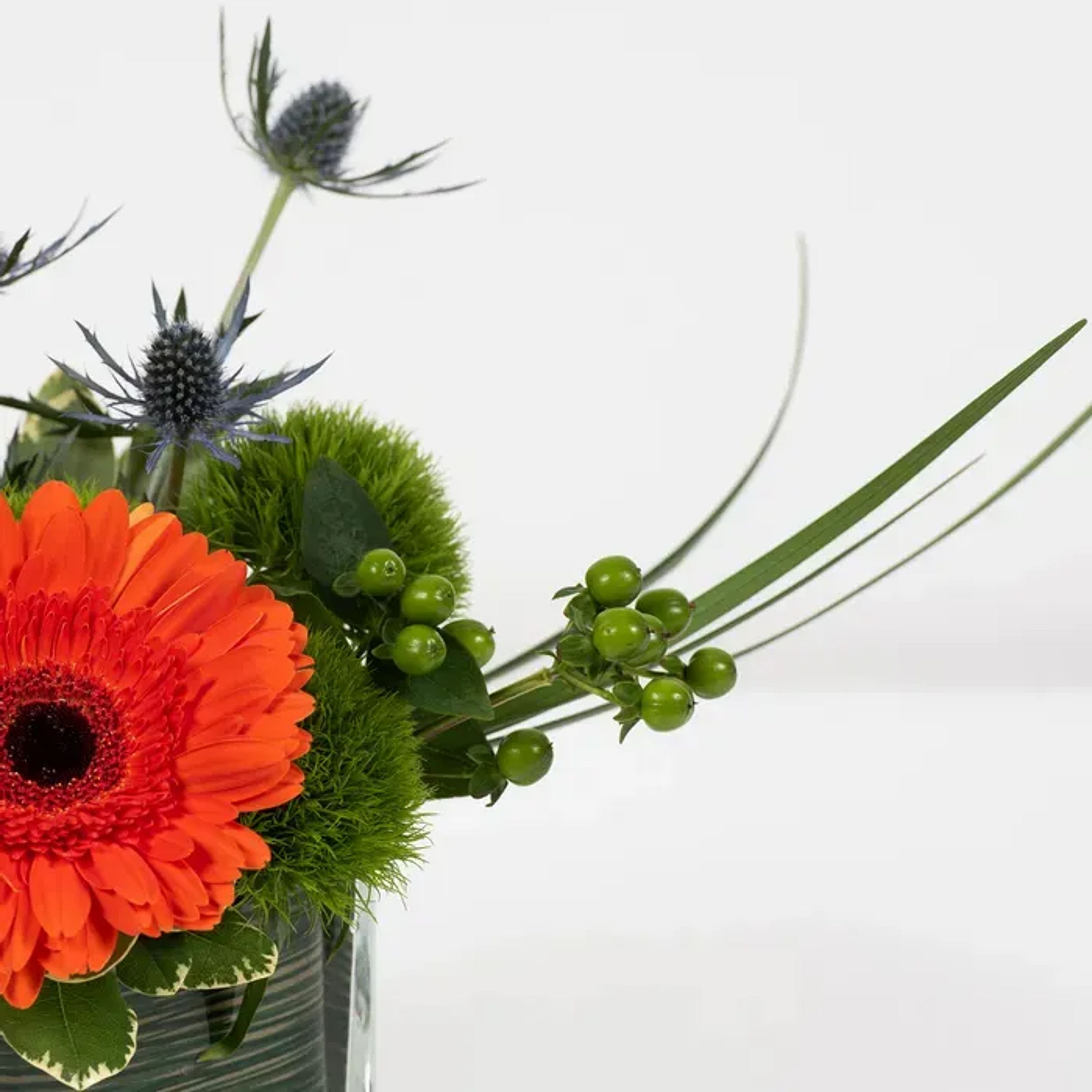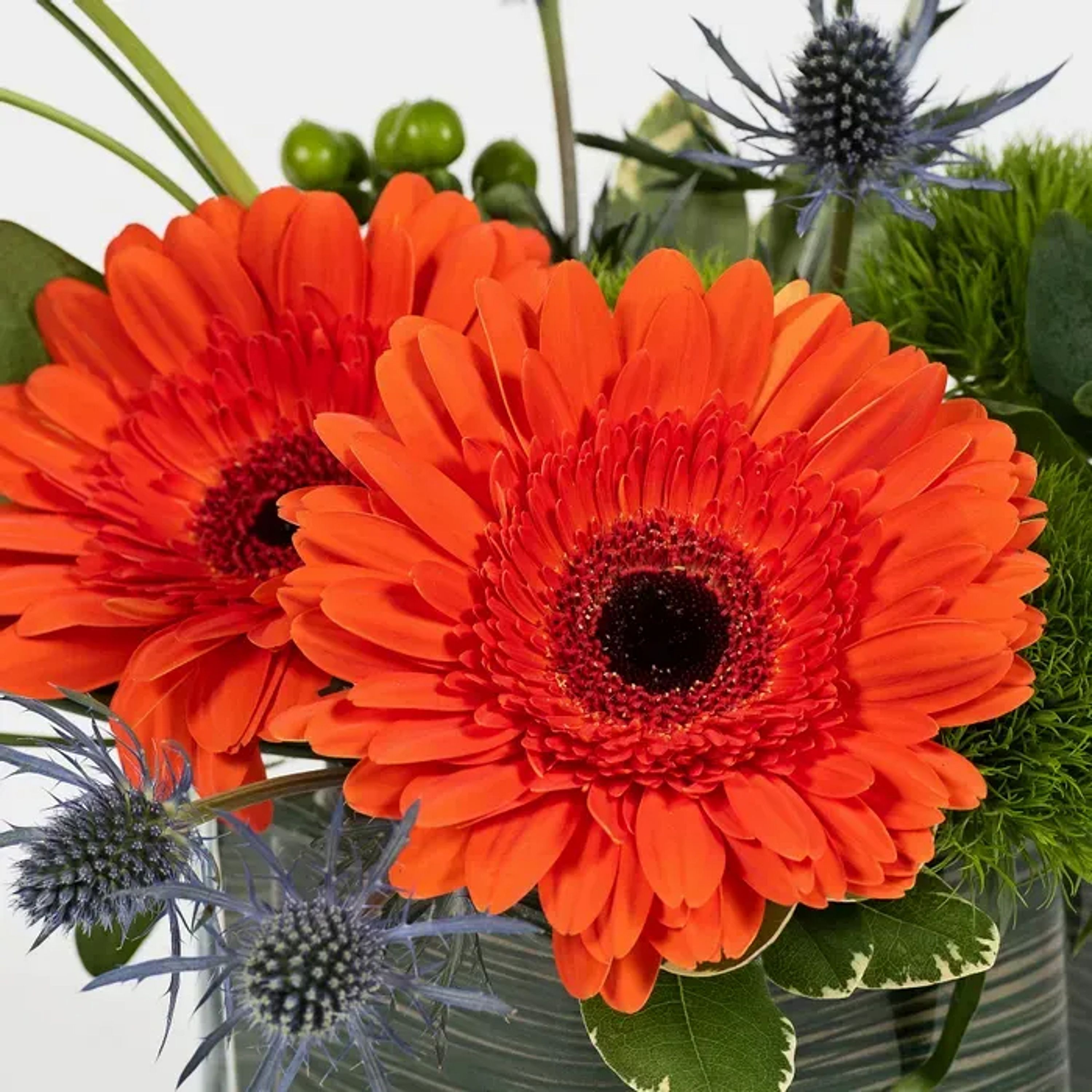 This adorable arrangement of gerbera daisies and dianthus is whimsical, contemporary, and stylish all at once.