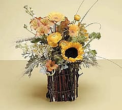 Twig basket has yellow and white flowers.