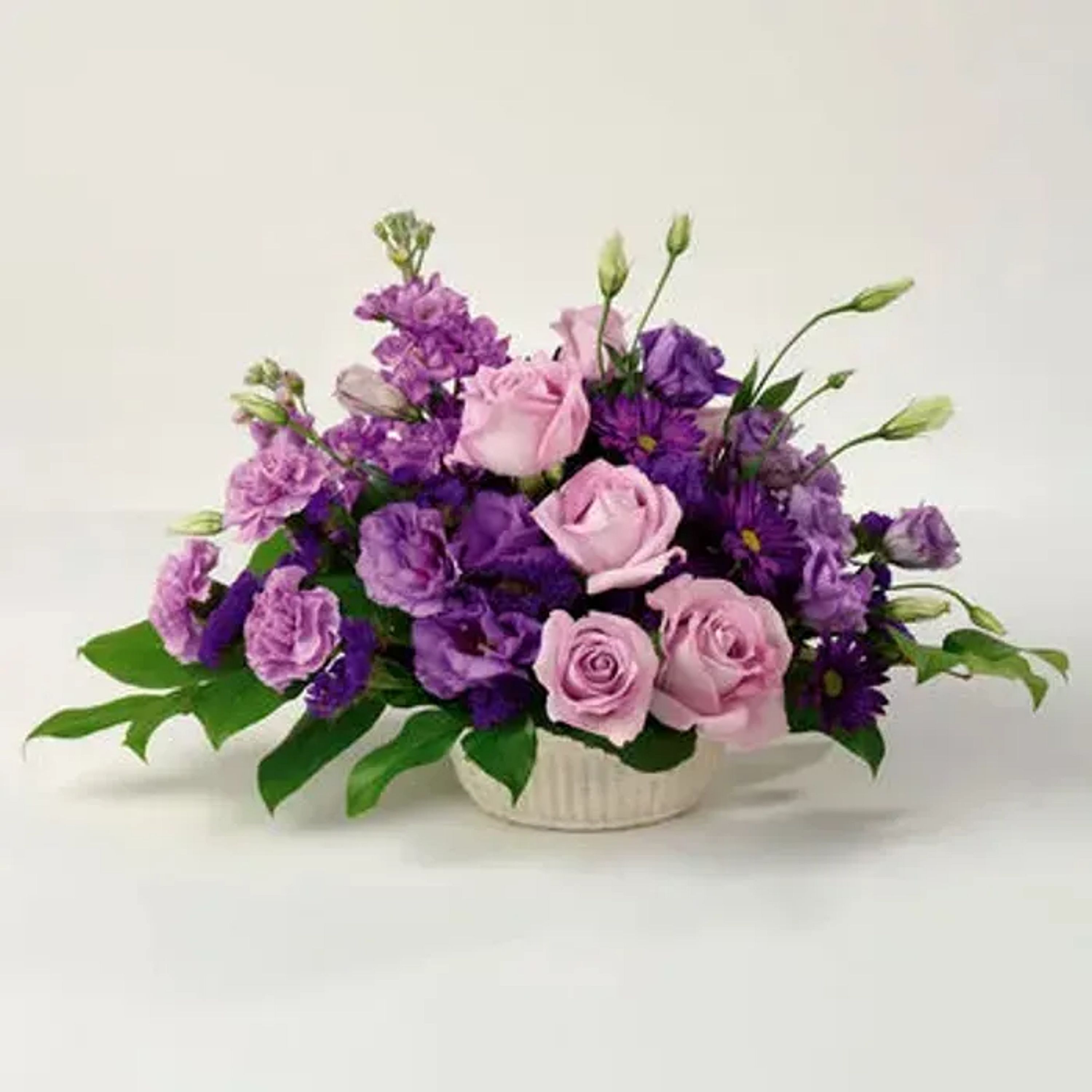 Regal purple draws "oohs" and "aahs" in this lovely centerpiece of roses, lisianthus, carnations and more!