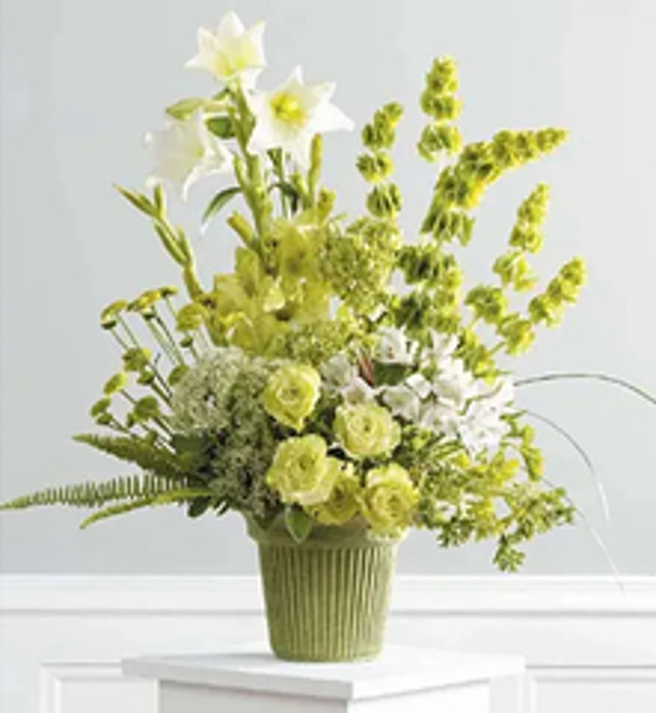 Mache with bells, kermit buttons,green glads, white alstro and lilies