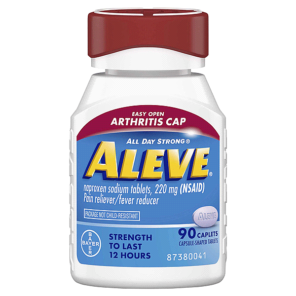 Aleve Arthritis Caplets provide long-lasting relief from minor arthritis pain, joint stiffness, and inflammation. With a powerful 220mg dose of naproxen sodium in each caplet, Aleve works at the site of pain for up to 12 hours—just two pills per day can help keep you moving.