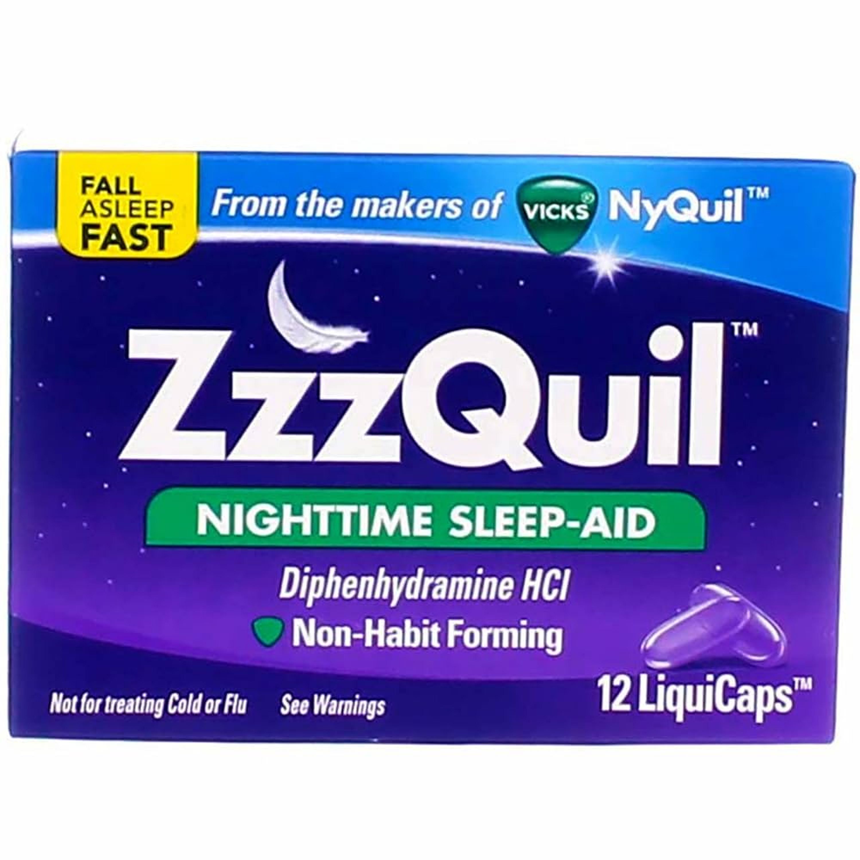 ZzzQuil Nighttime Sleep Aid helps you fall asleep fast, so you can wake up feeling refreshed. From the makers of Vicks NyQuil, this non-habit-forming sleep aid contains diphenhydramine HCl to gently and effectively help with occasional sleeplessness—without pain relievers or alcohol.