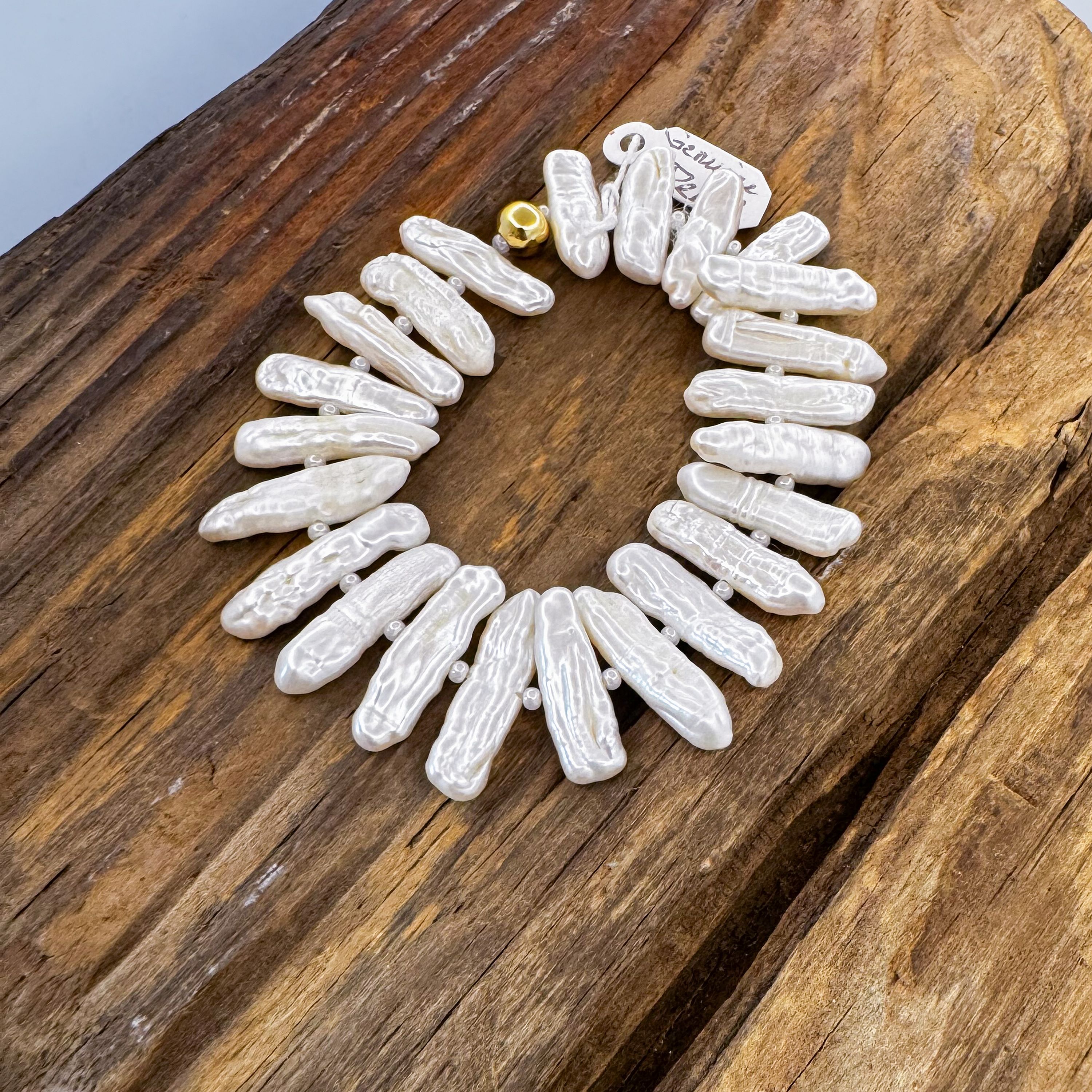 Bold, elegant, and effortlessly coastal. This handcrafted bracelet features genuine baroque-style freshwater pearls accented with delicate round pearls, creating a striking and textured silhouette. Each piece is strung on stretch cord for a comfortable and flexible fit.