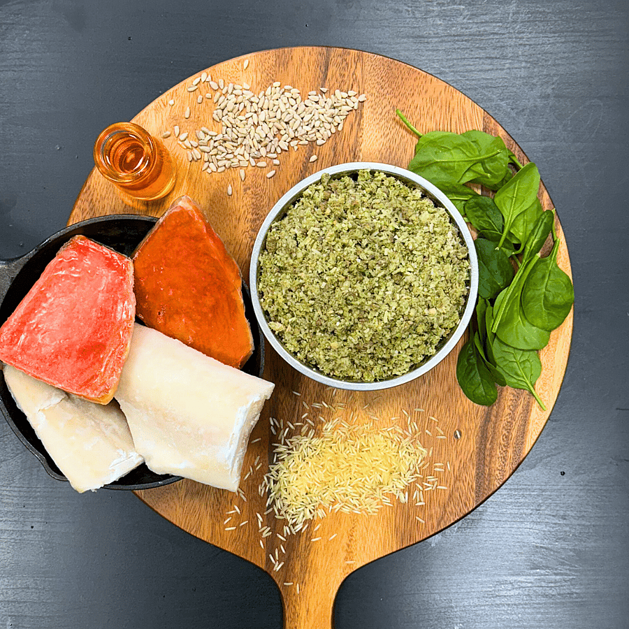 Ingredients: Pollock (wild caught), Basmati Rice, Salmon (wild caught), Spinach, Beef Liver, Water, Sunflower Seeds, Calcium Carbonate, Wheat Germ Oil, Psyllium Husk, Iodized Salt, Zinc Gluconate, Organic Kelp