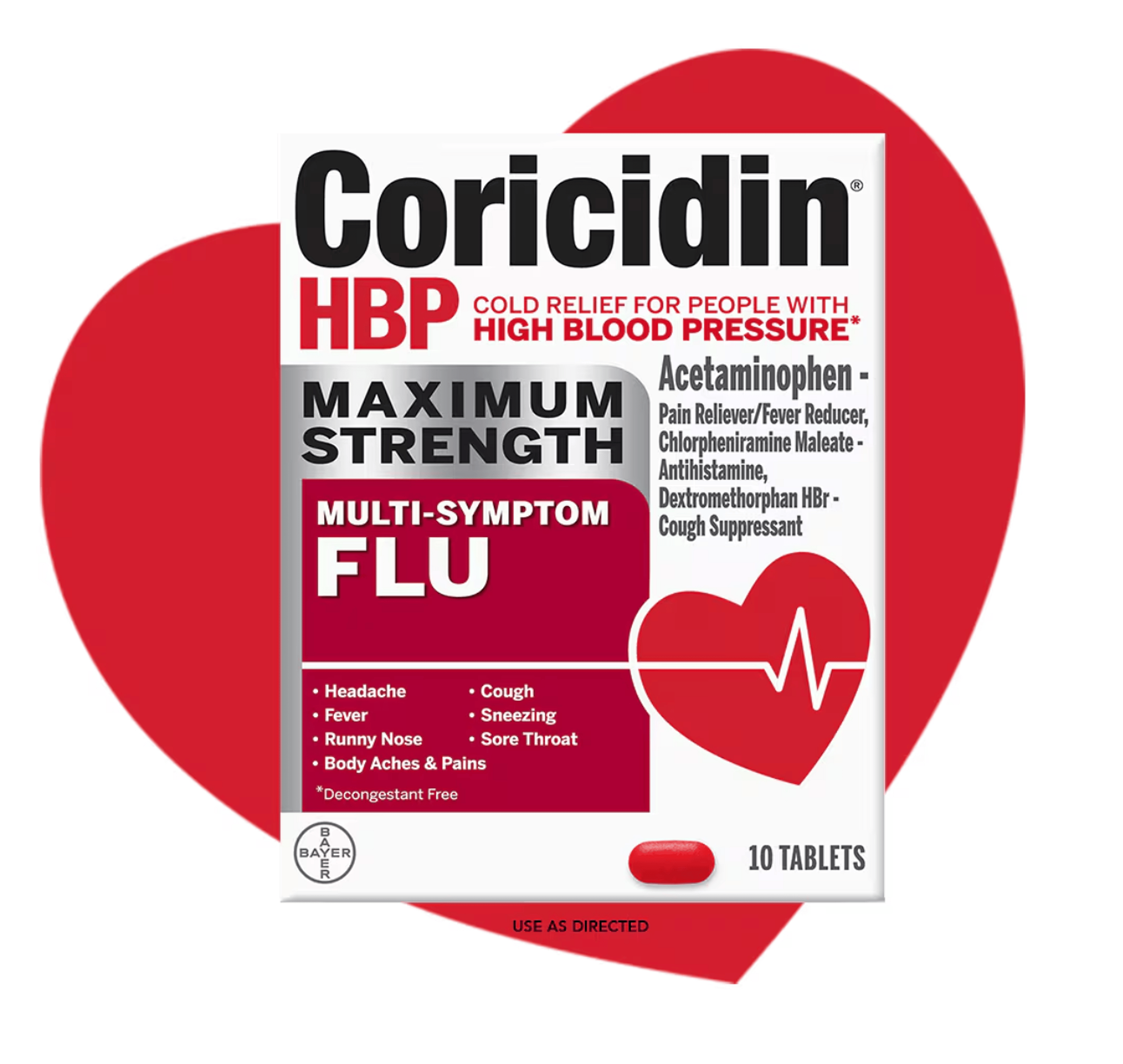 Coricidin HBP Multi-Symptom Cold & Flu is specially formulated for people with high blood pressure. It delivers powerful relief from cold and flu symptoms—including cough, runny nose, sneezing, fever, and body aches—without raising blood pressure.