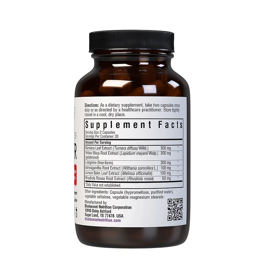Powerful blend of traditional botanicals — includes gelatinized maca (for enhanced absorption), Damiana, L‑Arginine, Ashwagandha, Lemon Balm, and Rhodiola extracts to support vitality and mood.