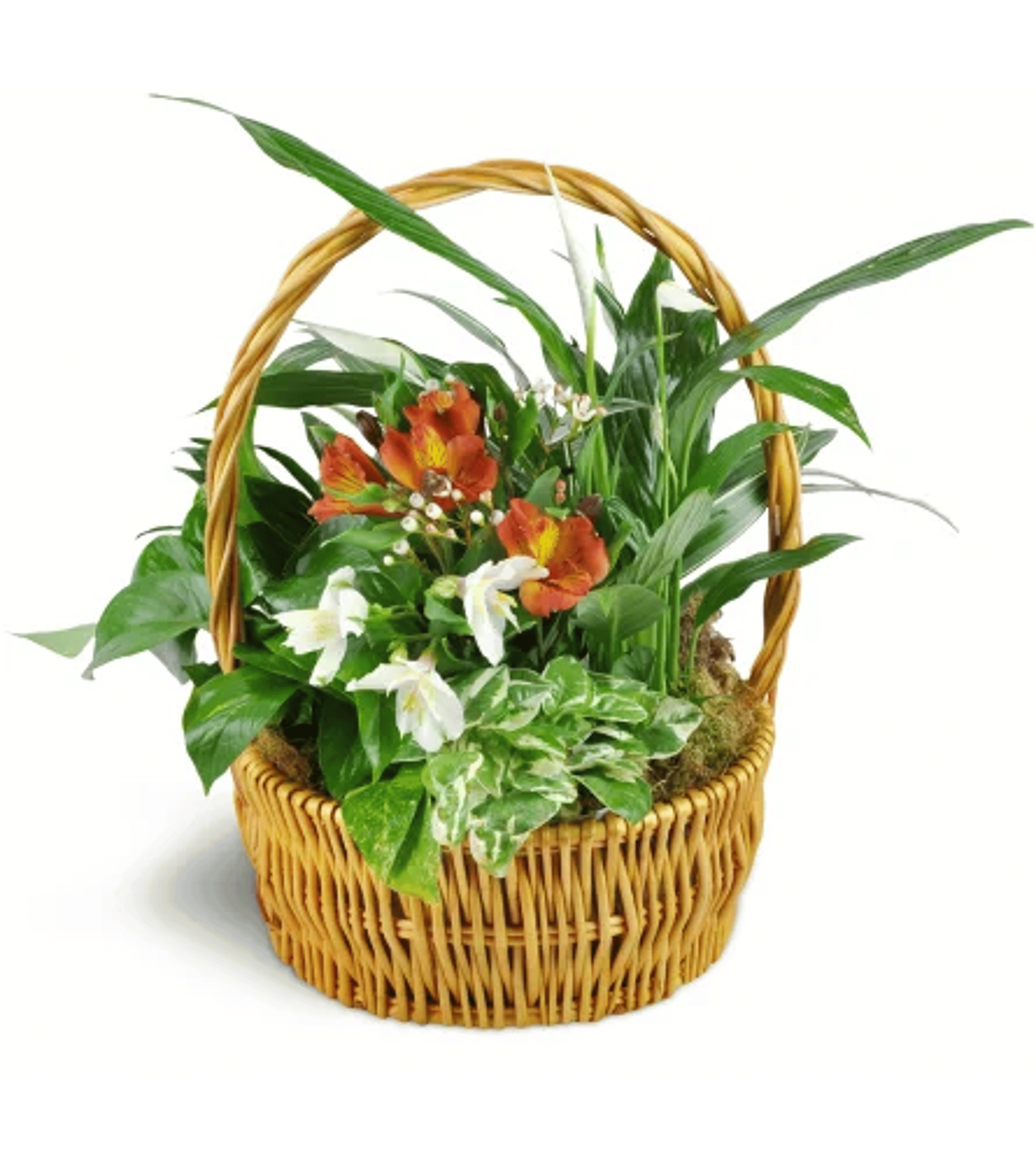 Blooming and green plants are arranged in a basket with accents of beautiful Peruvian lilies.