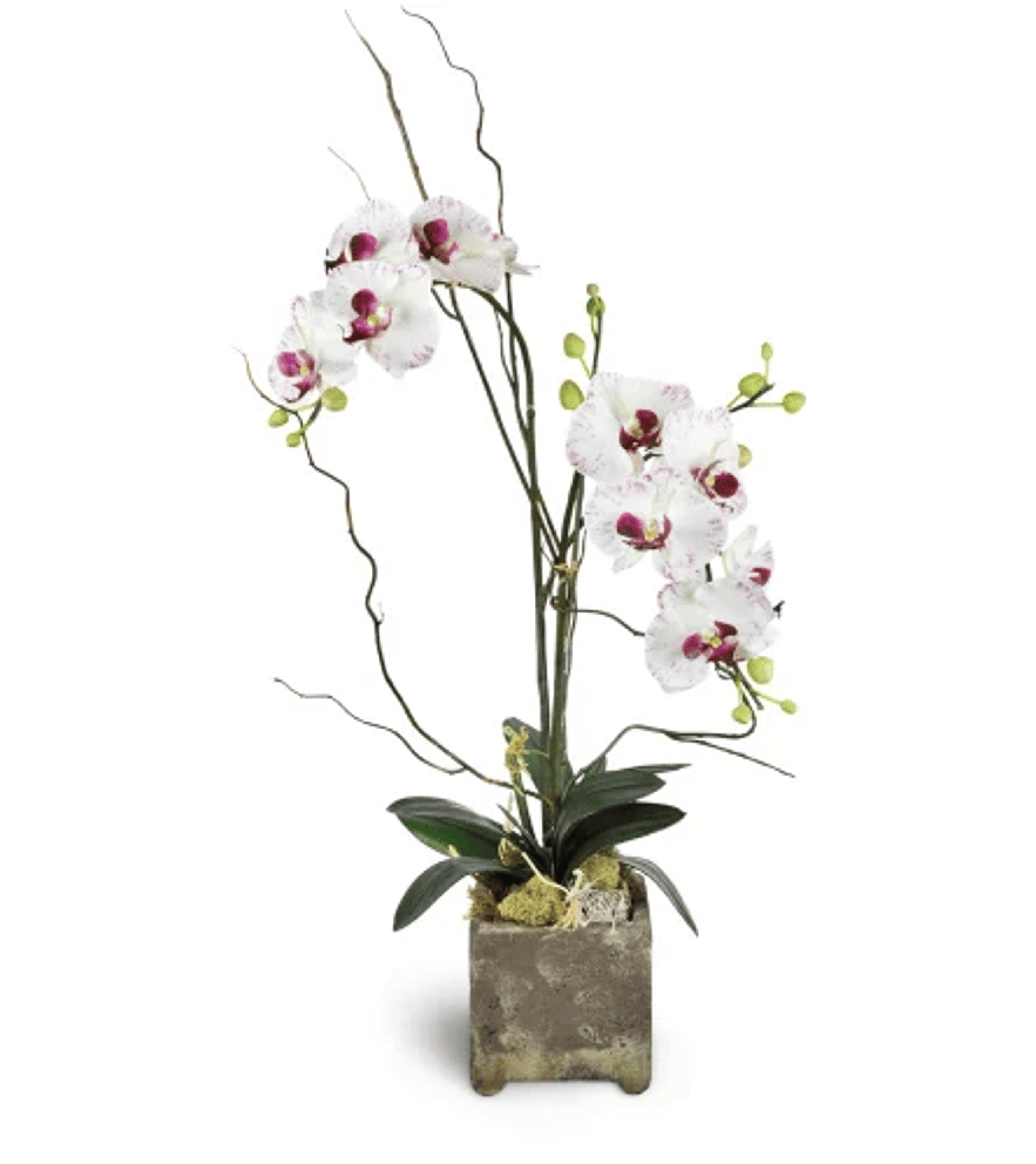 Featuring one double-stem orchid in a decorative planter. Color may vary based on availability.