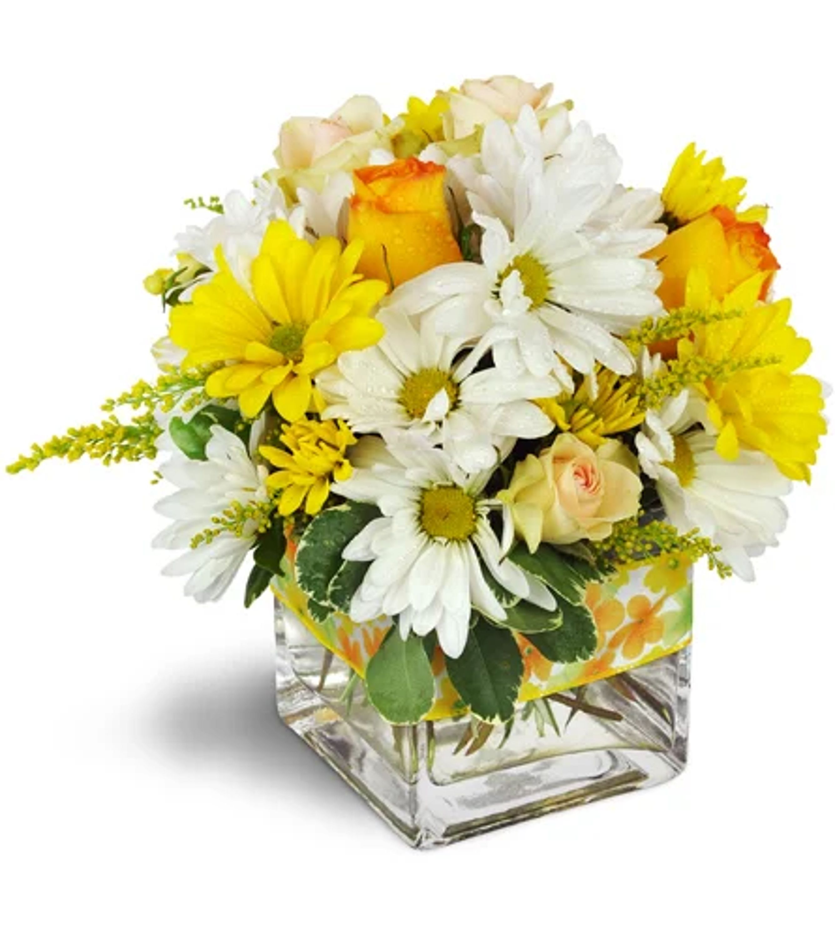 Send a gift of sunshine to your special someone! Make it a cheerful surprise that's bursting with style and color. Yellow and white daisies are beautifully accented with light pink spray roses and orange roses.