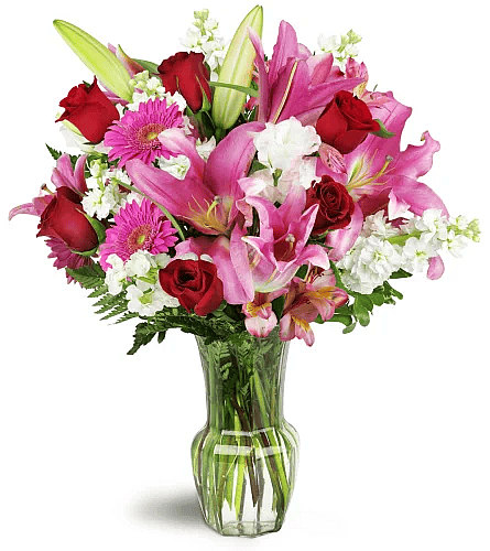 Deep red roses, lush lilies, and pretty pink Gerbera daisies are arranged in a clear glass vase.