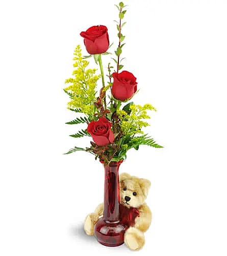 Three red roses are arranged with greenery in a bud vase and encircled by a plush bear.