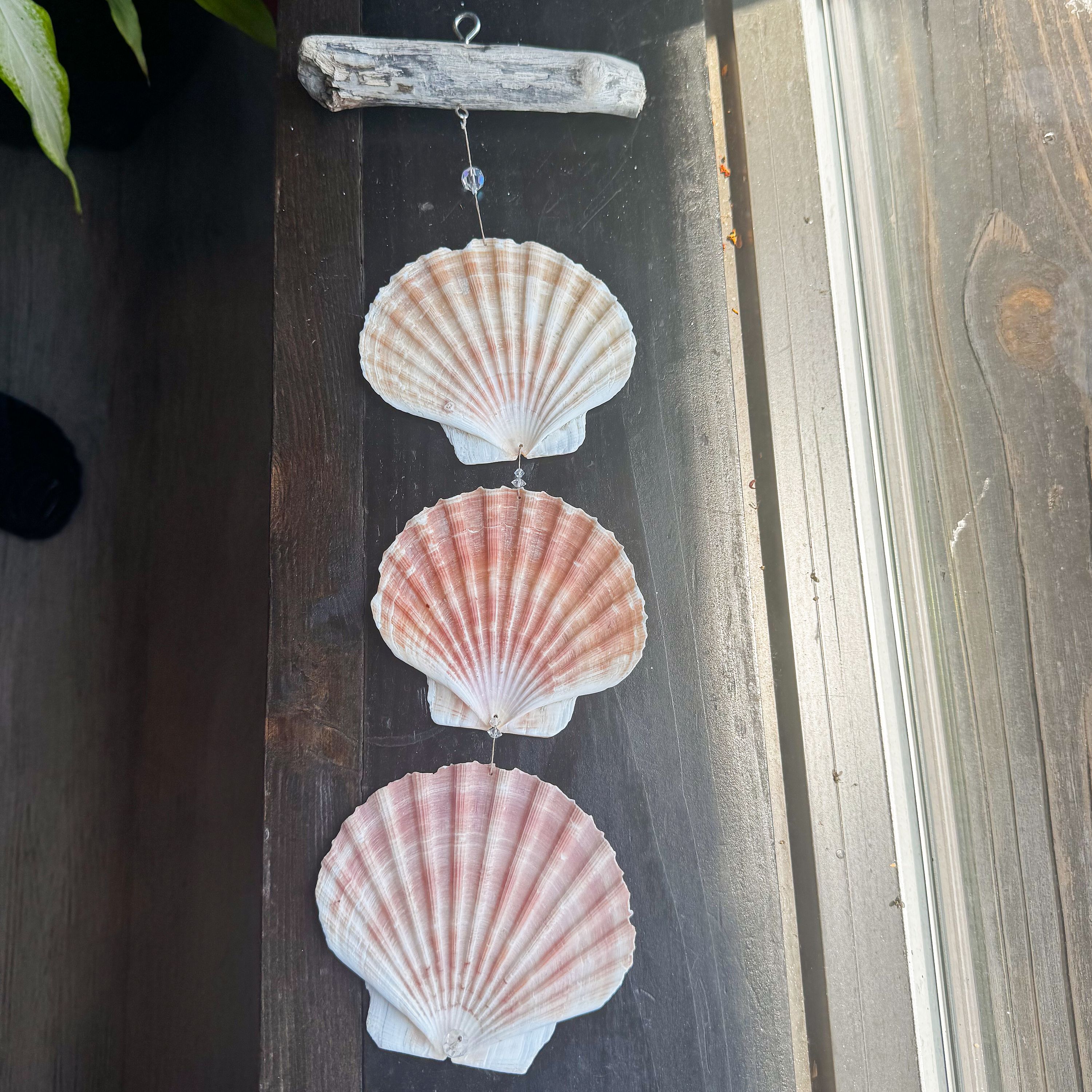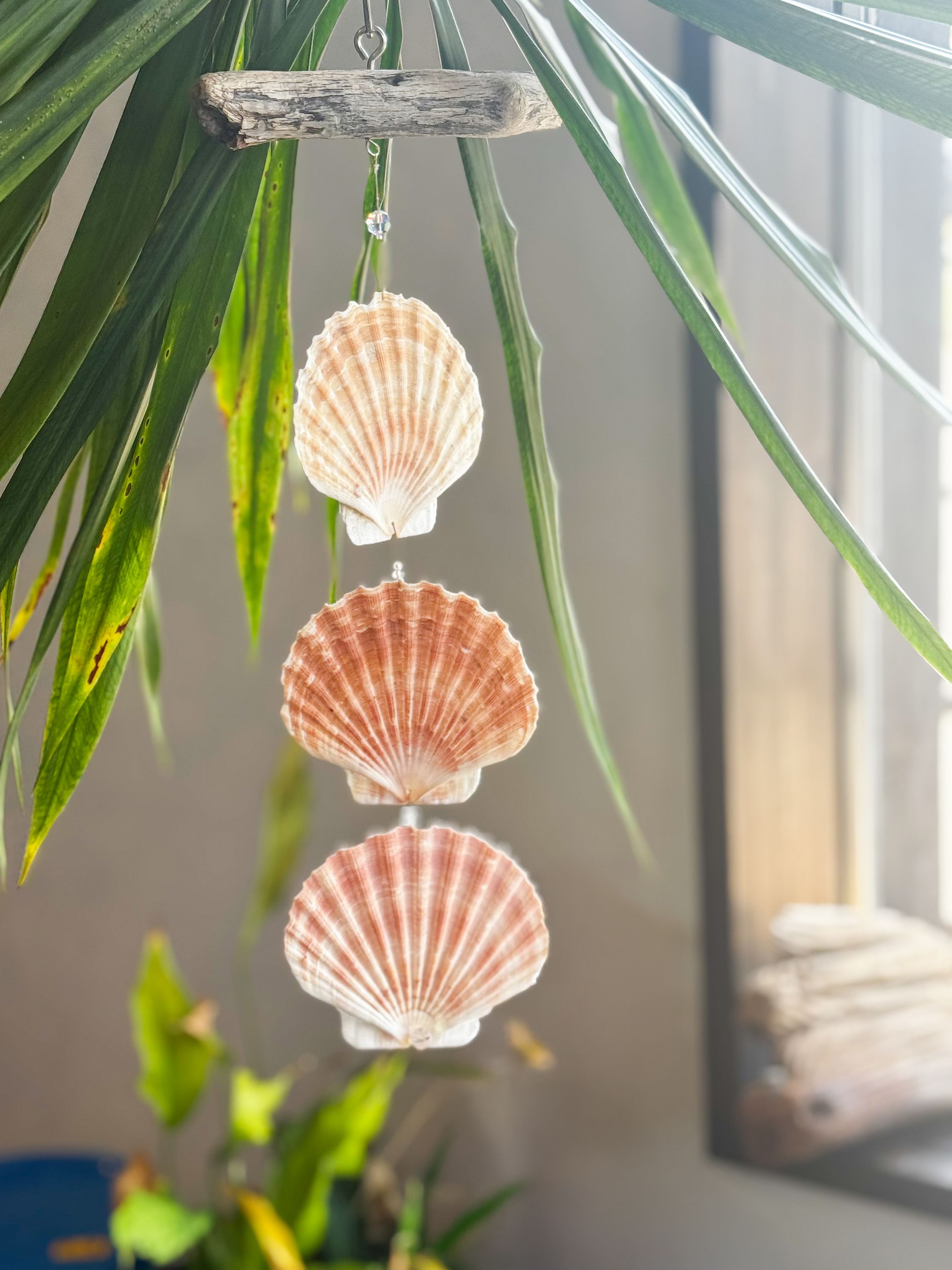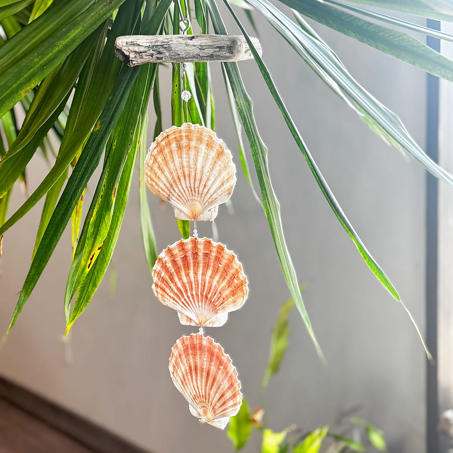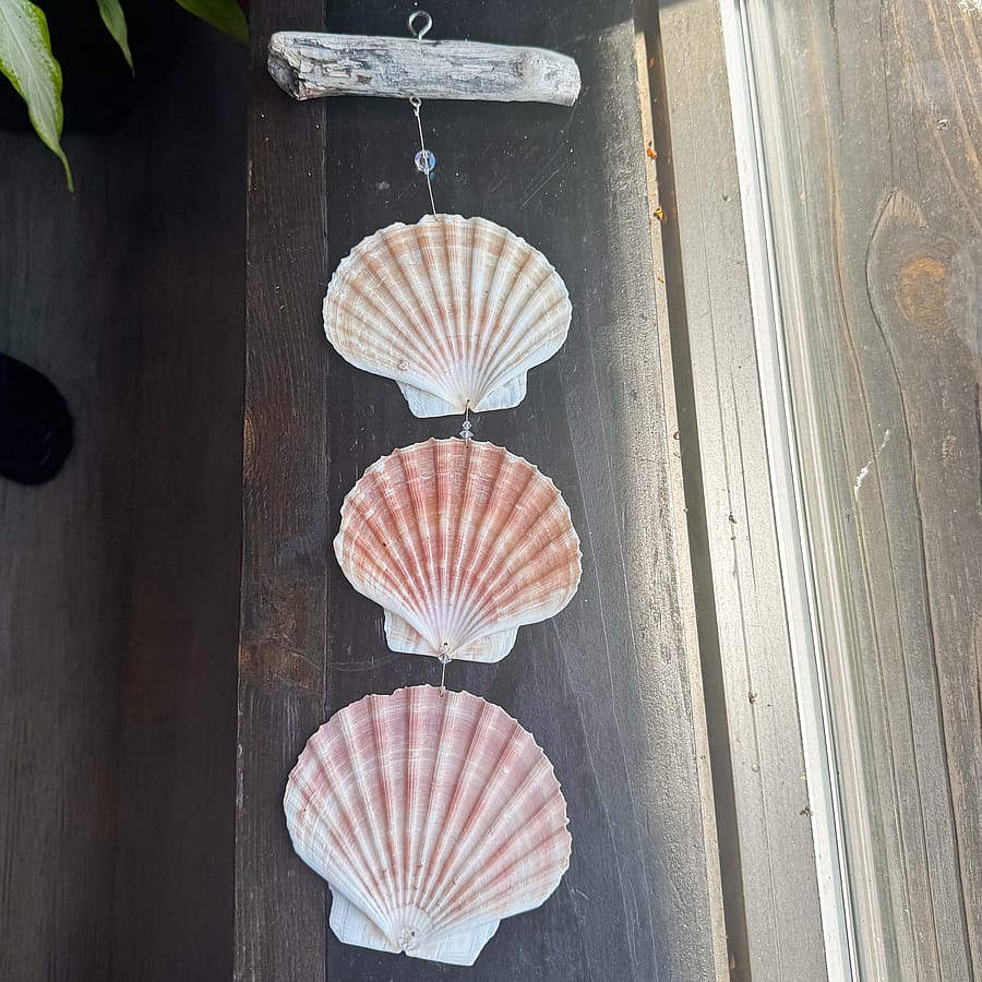 Bring a soft touch of the sea into your home with this elegant 3-Shell Indoor Wind Chime. Made with genuine Irish Flare shells and accented with real crystals, this handcrafted piece hangs from a rustic driftwood-style top for an effortlessly coastal look. The natural hues of the shells and the subtle sparkle of the crystal catch the light beautifully, adding charm to any nook or sunny windowsill.