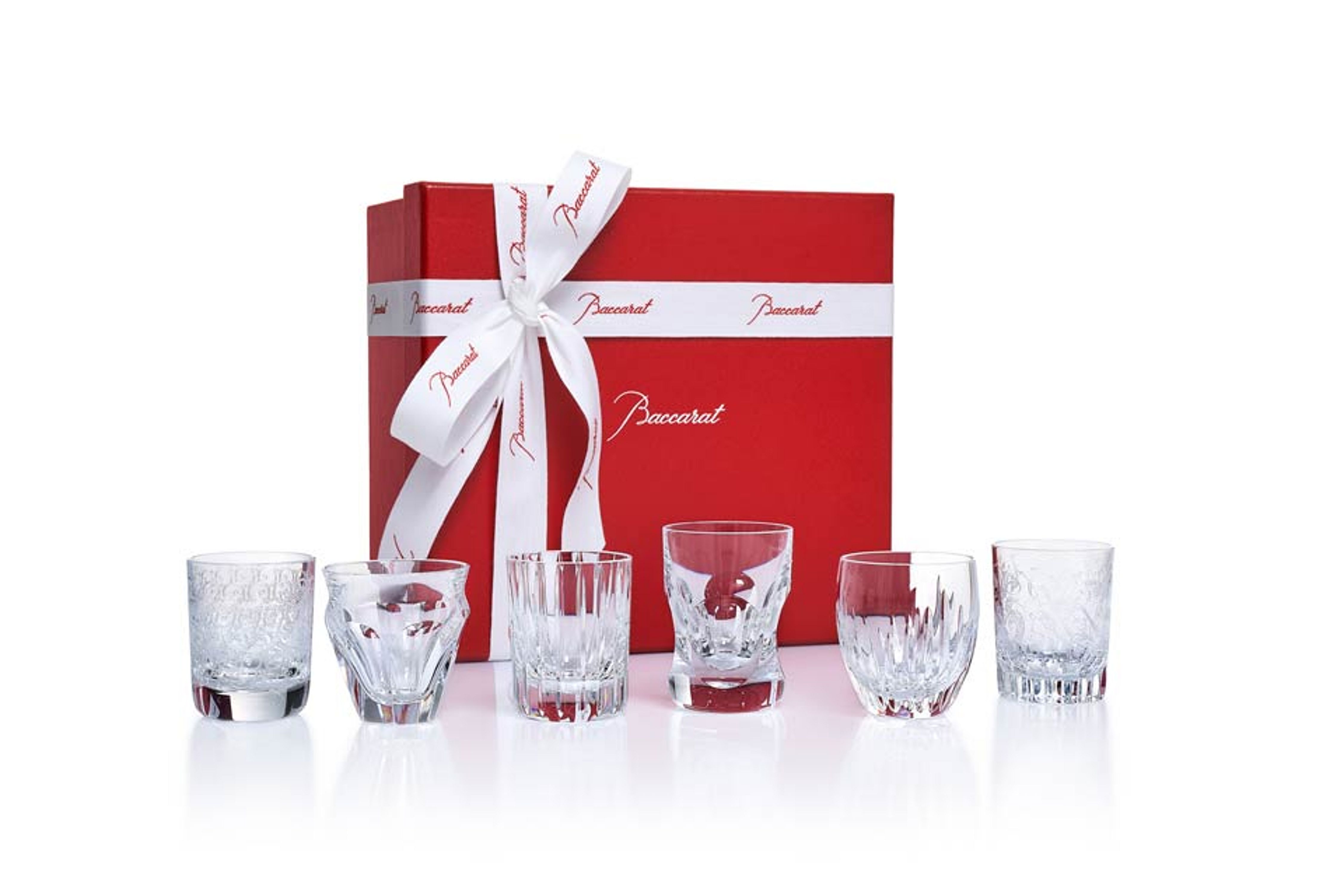 Everyday Baccarat set of six assorted shot glasses in the patterns of Rohan, Talleyrand, Harmonie, Orion, Massena, and Parme. Key Features: - Set of six shot glasses - Height: 1.8" - Capacity: 2.0 oz.