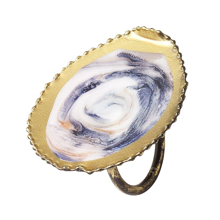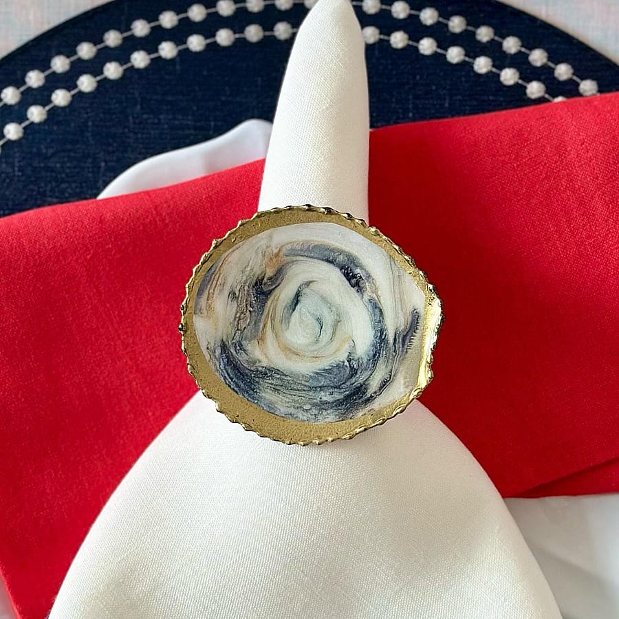 The Painted Oyster napkin ring is one of our favorite table accessories this season. Its large round face painted with a metallic swirl will make a fun and bold statement on your table.