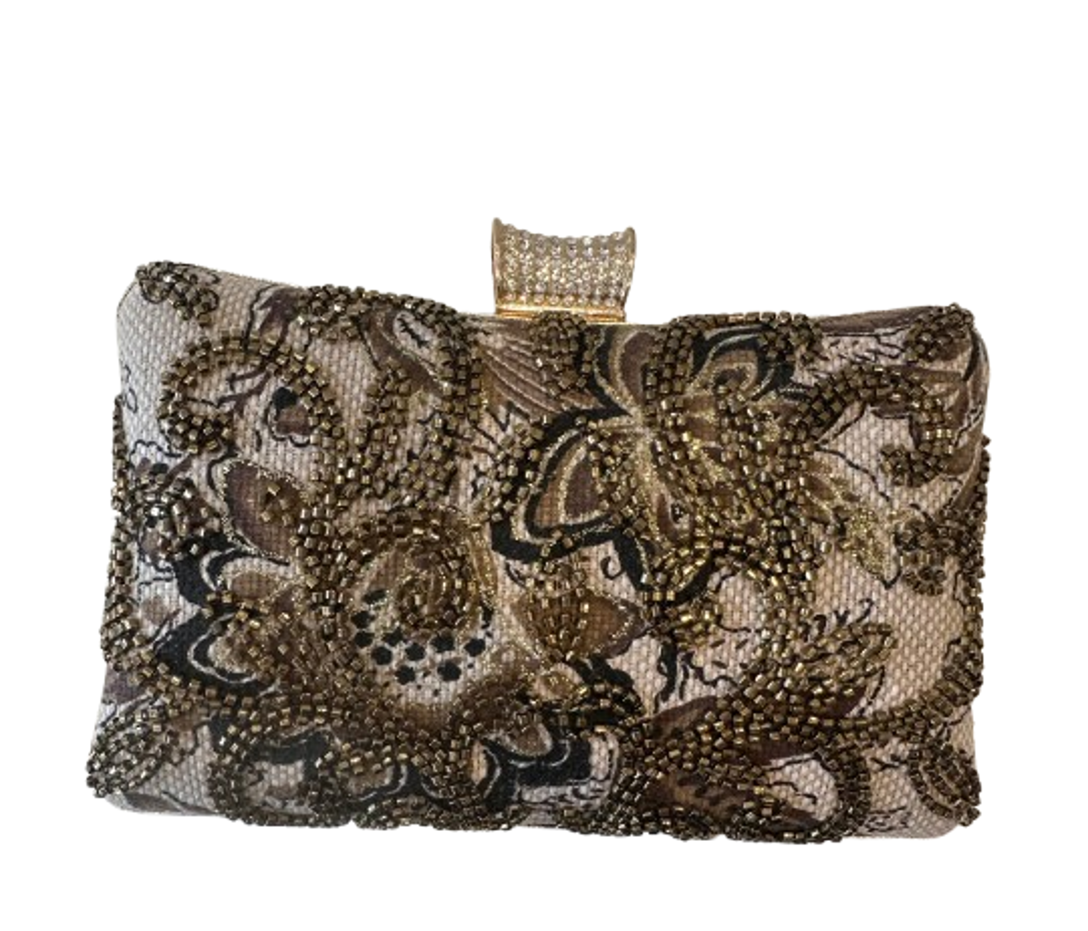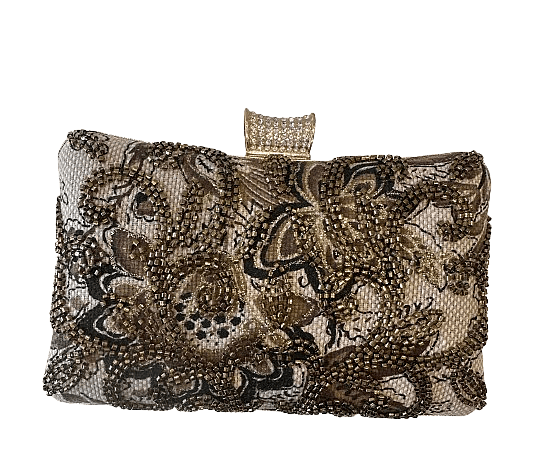 Embossed beaded clutch with floral detail neutral tones With Gold Chain