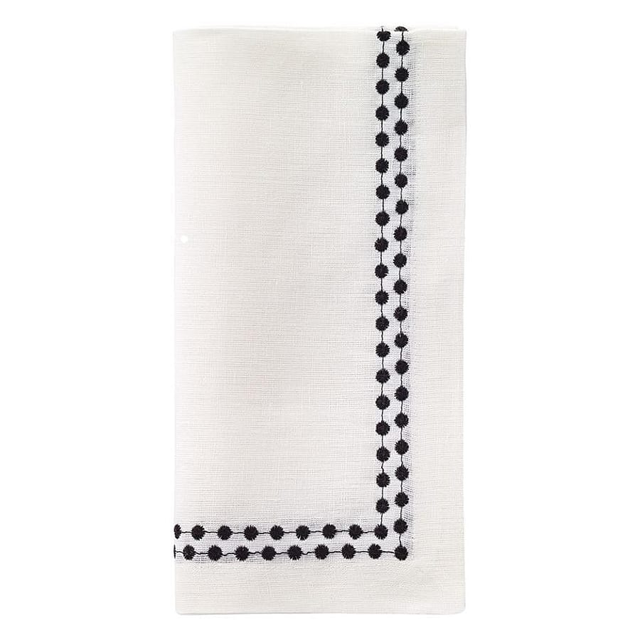 Modern and refined, these 21" square white napkins are finished with sleek black pearl-like embroidery along the edges. Made from a soft, durable cotton and polyester blend, they offer a crisp, high-contrast look that suits both formal dinners and everyday minimalist settings.
