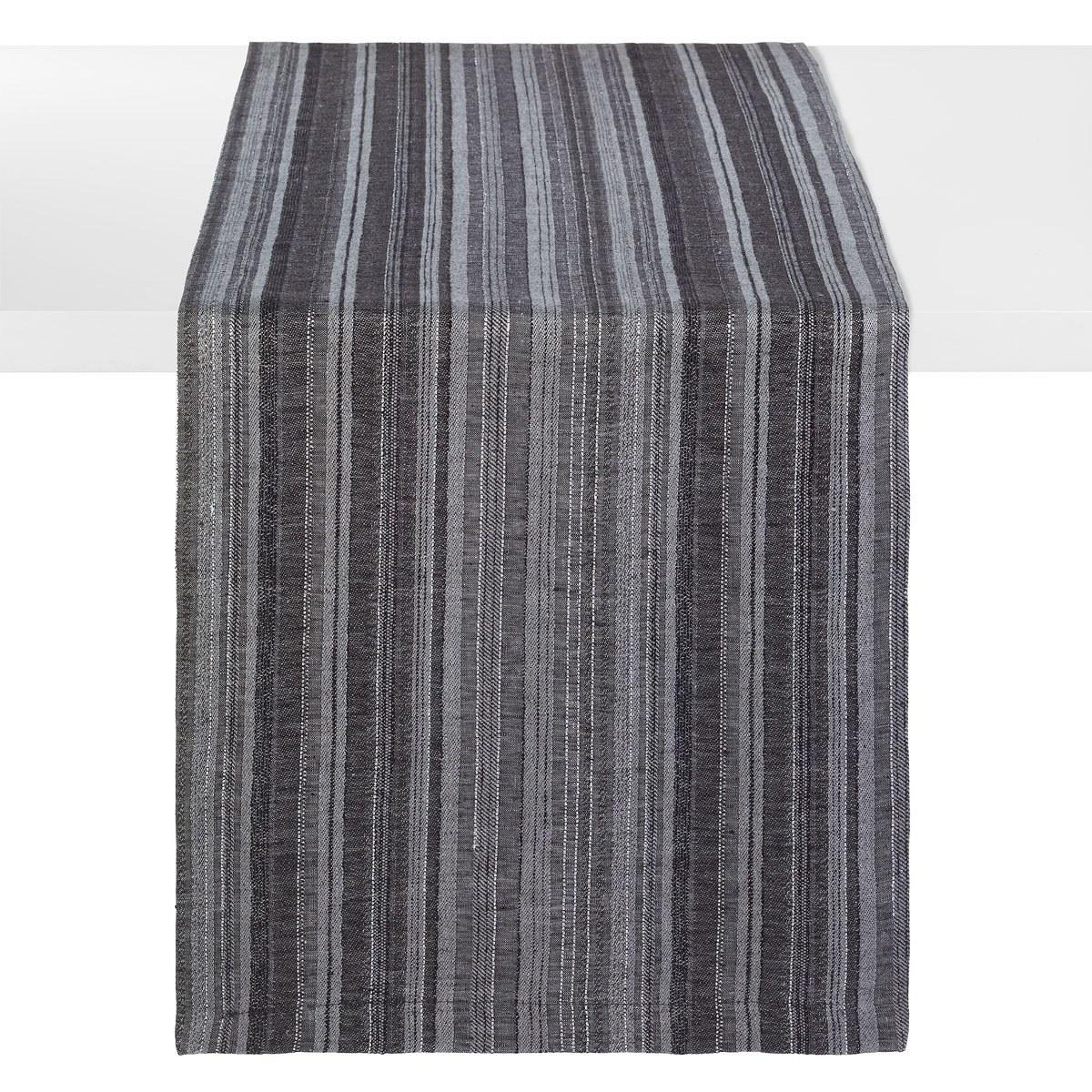 Sleek and sophisticated, this charcoal runner from Bodrum's Midas collection features metallic woven striped for a subtle, elegant shimmer. Crafted from a soft linen blend, it's perfect for both modern and formal table settings.