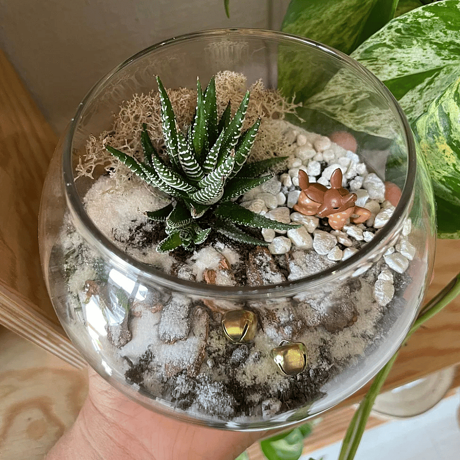 Introducing our new seasonal design, Let It Snow – a captivating miniature world that embodies the essence of winter. Glittering sand colors and delicate moss create a winter wonderland, complete with a frosty Zebra plant. Experience the tranquility and beauty of the season in this charming display, perfect for any space. Embrace the enchantment of nature indoors with our Let It Snow Terrarium.