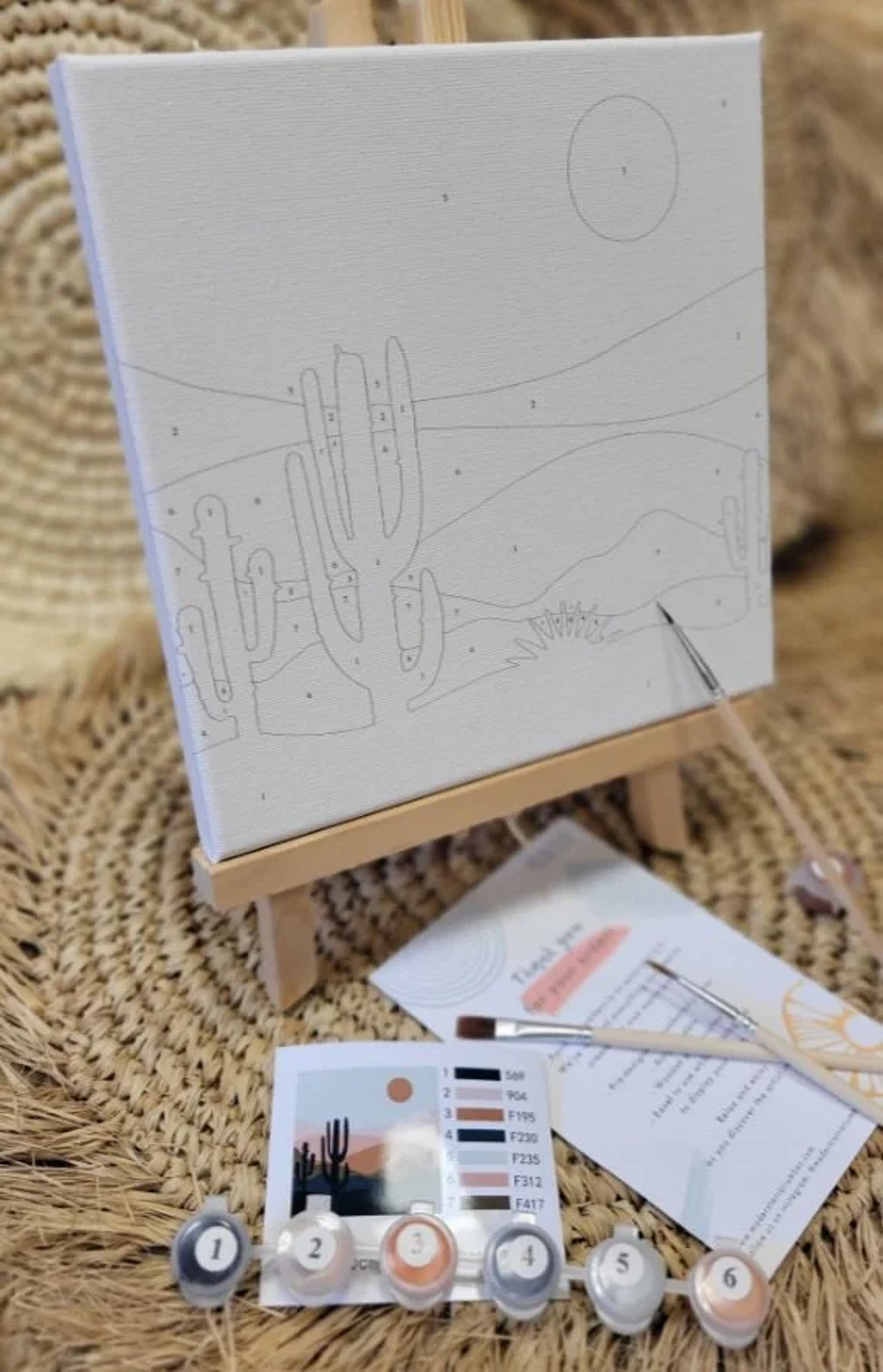 Paint by numbers is as easy as 1-2-3. We've included everything you need to create your own masterpiece: -Pre-designed & numbered canvas (8x8 inches) -Acrylic paints (non-toxic) -Wooden paintbrushes -Easel to use while painting and to display your piece. Relax and enjoy as you discover the artist in you.