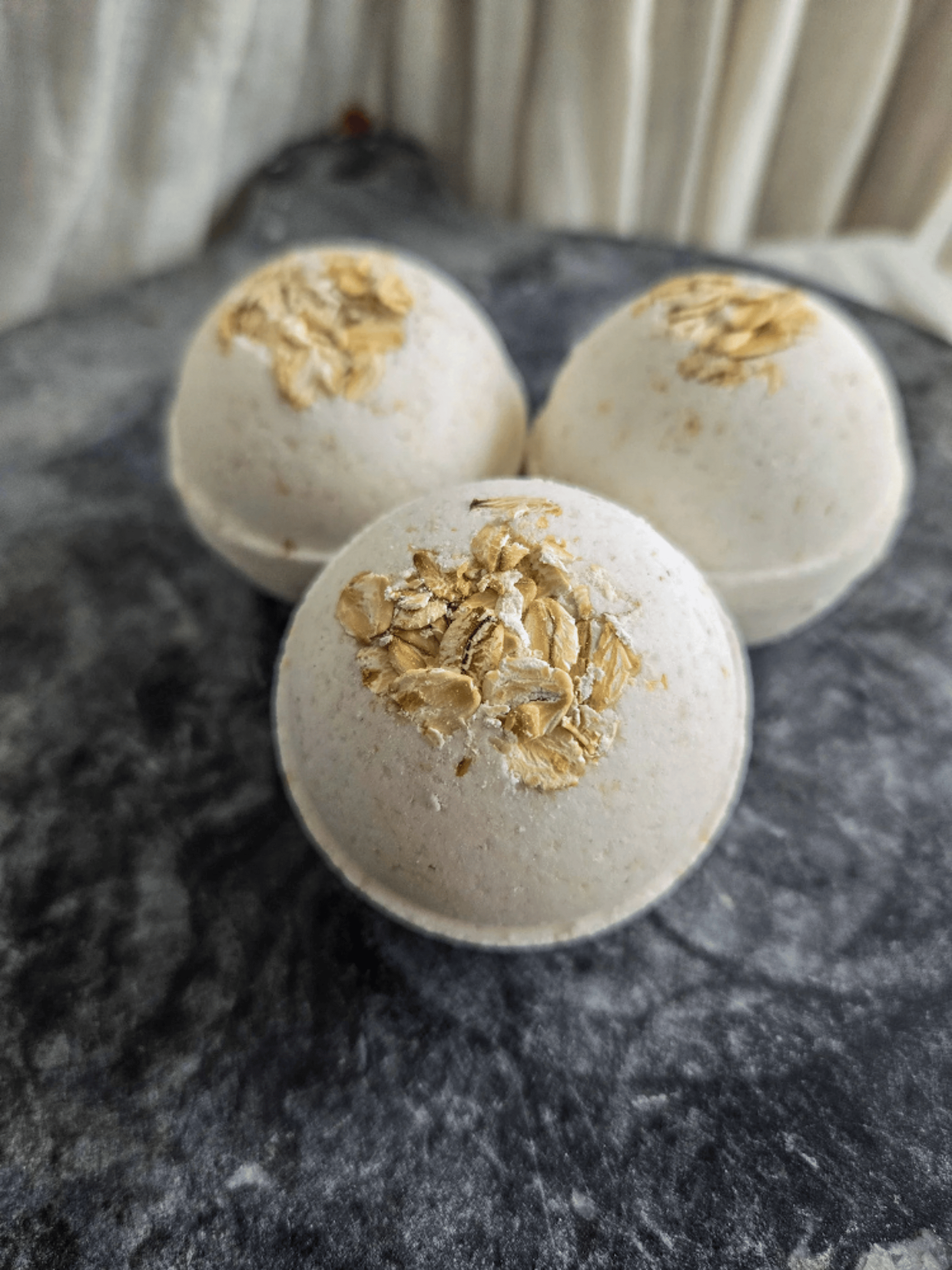 Nourishing bath bombs with oatmeal, honey & vanilla for soft and hydrated skin. Nourish, moisturize & center your body with these fizzies during your bath rituals. Ingredients: Baking soda, citric acid, cornstarch, epsom salt, sunflower oil, oatmeal, granulated honey, vanilla essence Size: Medium 2" diameter Weight: 3.5 oz. Packaging: Biodegradable shrink-wrapped for freshness.