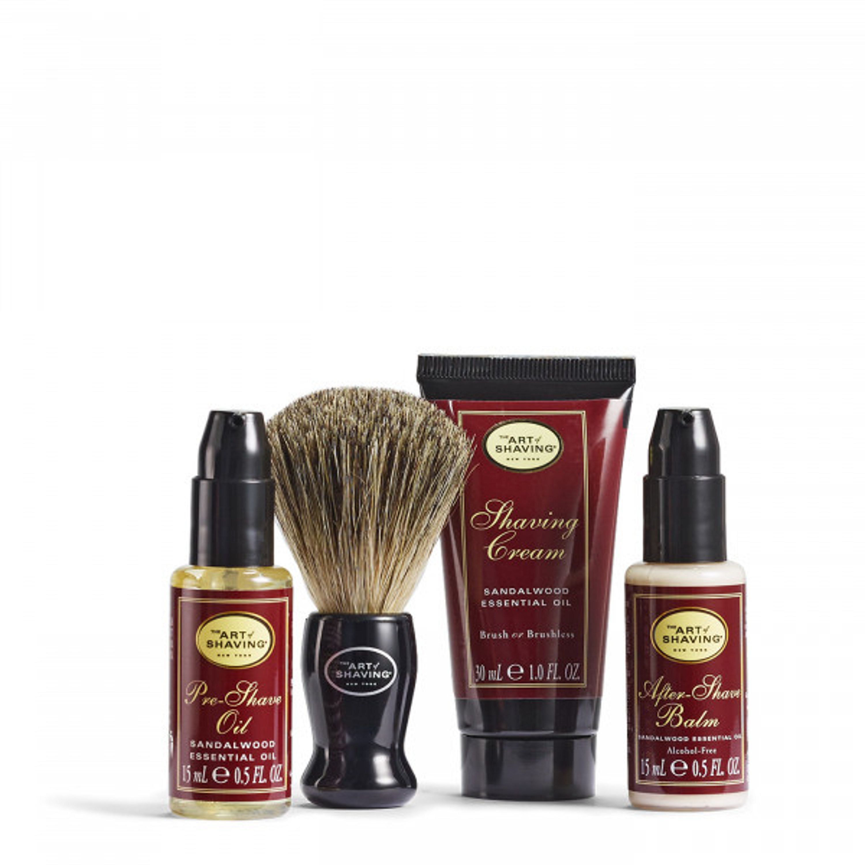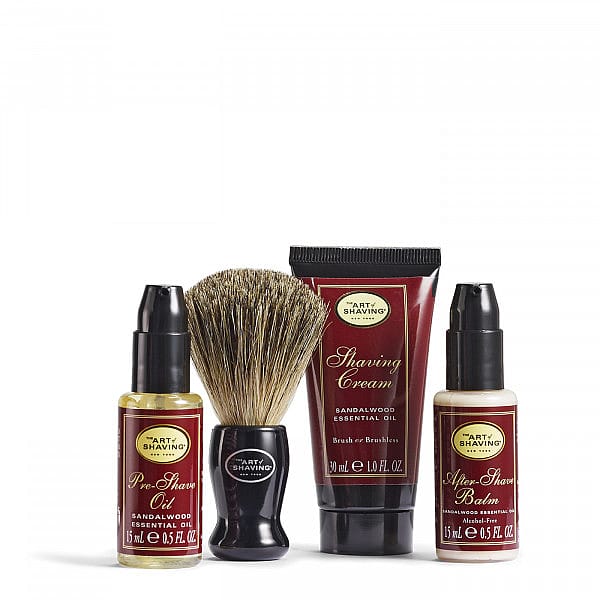 Includes: -Pre-Shave Oil (.5 fl. oz) -Shaving Cream (1 oz) -Trial Size Badger Shaving Brush -After-Shave Balm (.5 fl. oz)