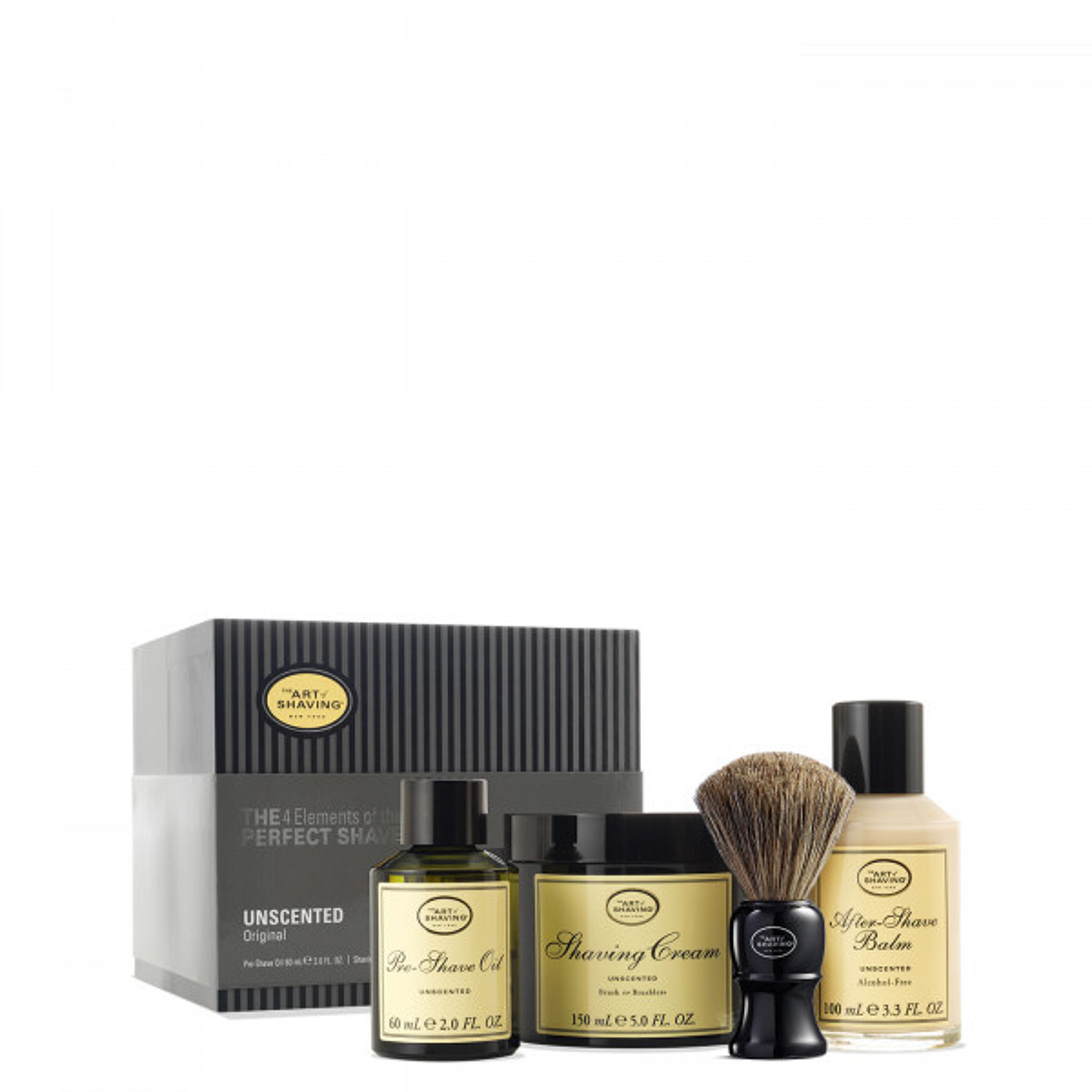 Includes: -Badger Hair Shaving Brush -Unscented Pre-Shave Oil (2 fl. oz) -Unscented Shaving Cream (5 oz) -Unscented After-Shave Balm (3.3 fl. oz)