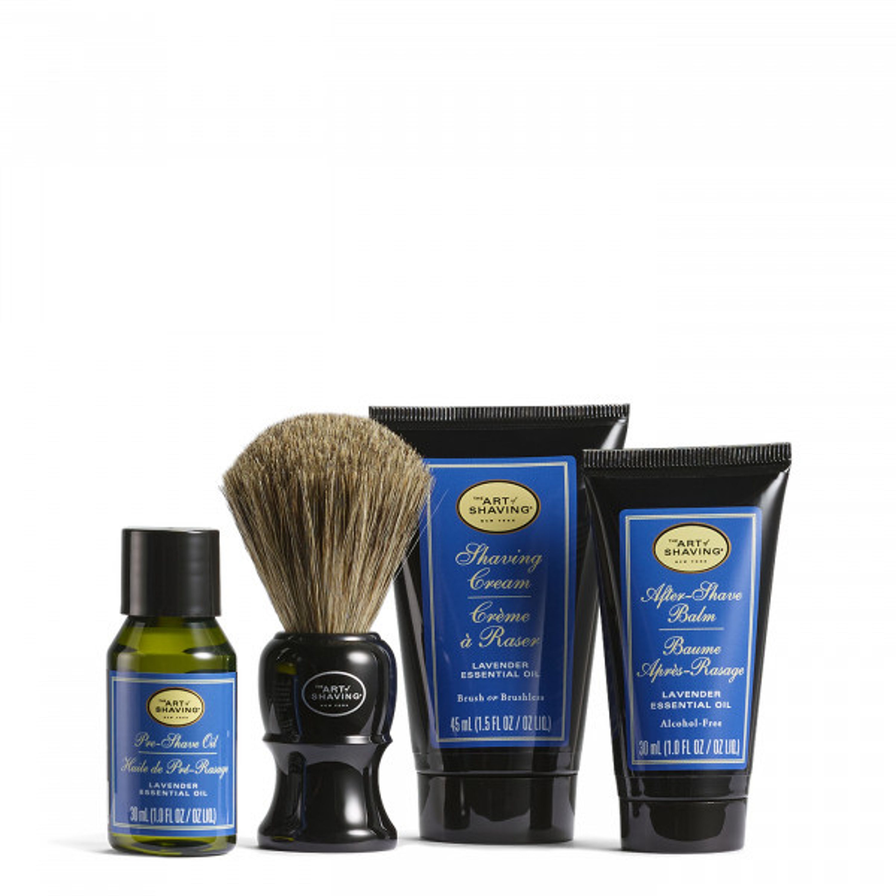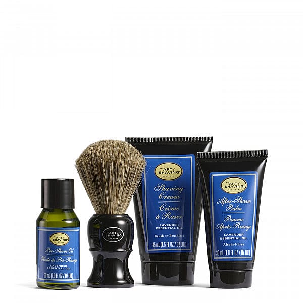 Includes: -Badger Hair Shaving Brush -Lavender Pre-Shave Oil Pump(1 fl. oz) -LavenderShaving Cream Pump(1.5 oz) -Lavender After-Shave Balm Pump (1 fl. oz)
