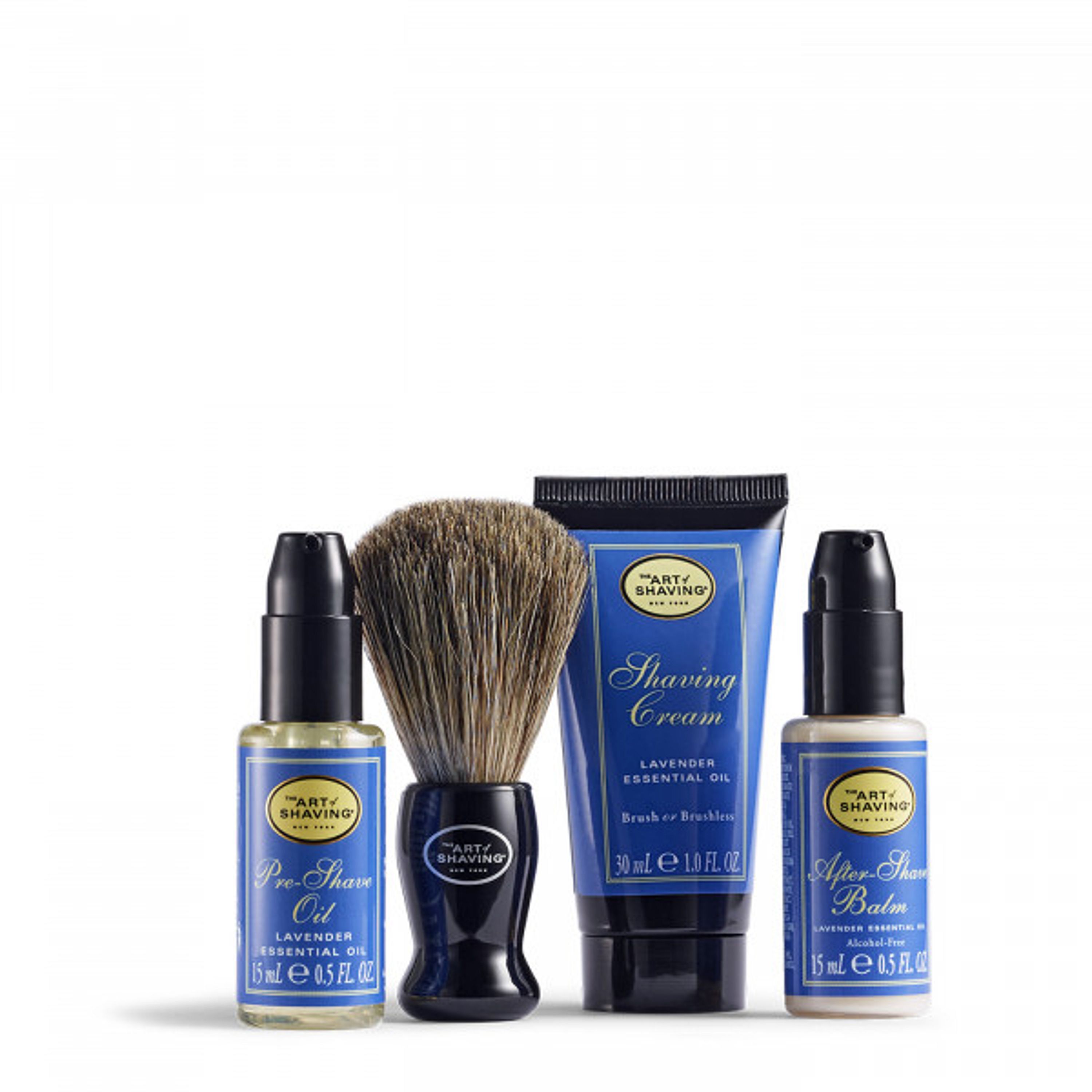 Includes: -Pre-Shave Oil (.5 fl. oz) -Shaving Cream (1 oz) -Trial Size Badger Shaving Brush -After-Shave Balm (.5 fl. oz)