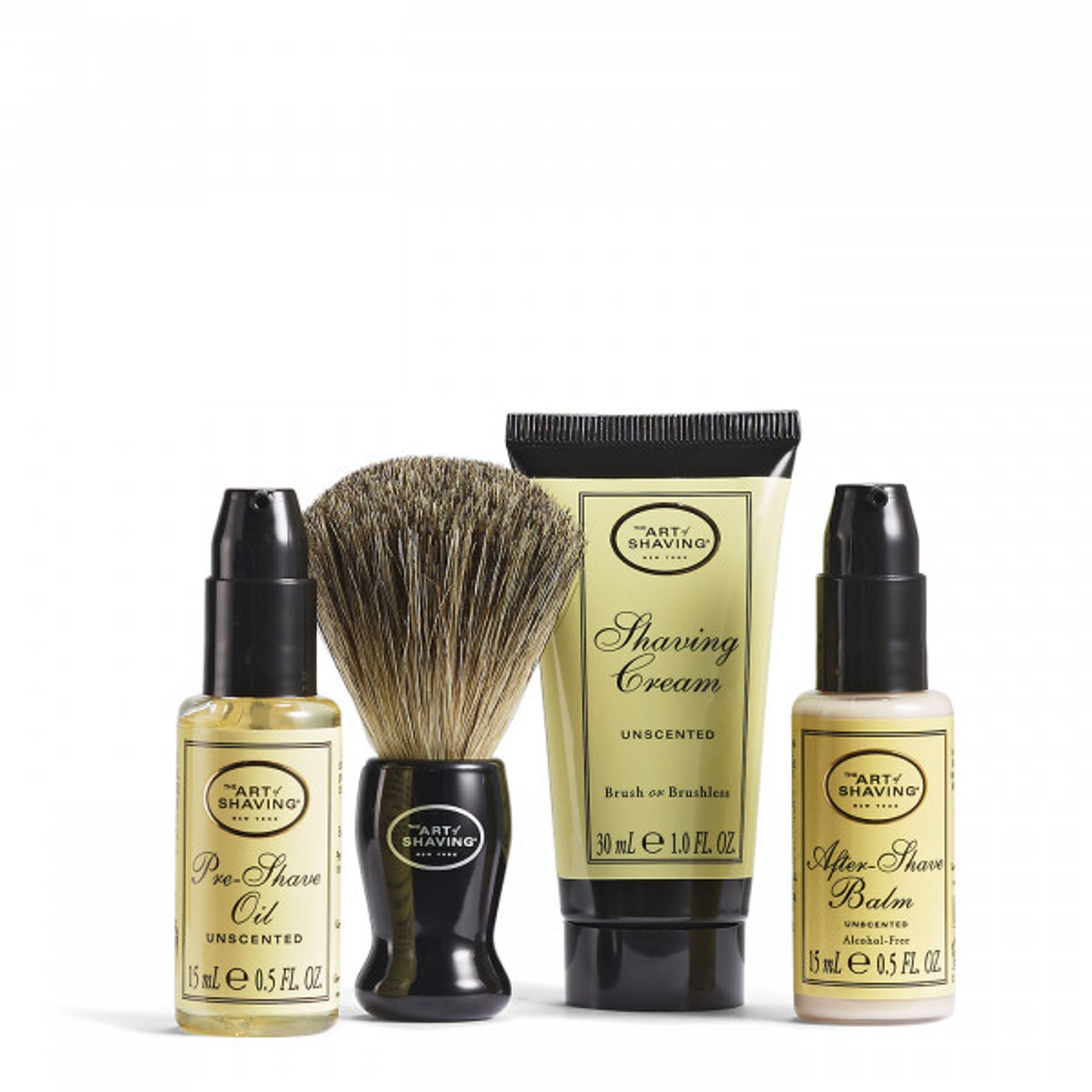 Includes: -Pre-Shave Oil (.5 fl. oz) -Shaving Cream (1 oz) -Trial Size Badger Shaving Brush -After-Shave Balm (.5 fl. oz)