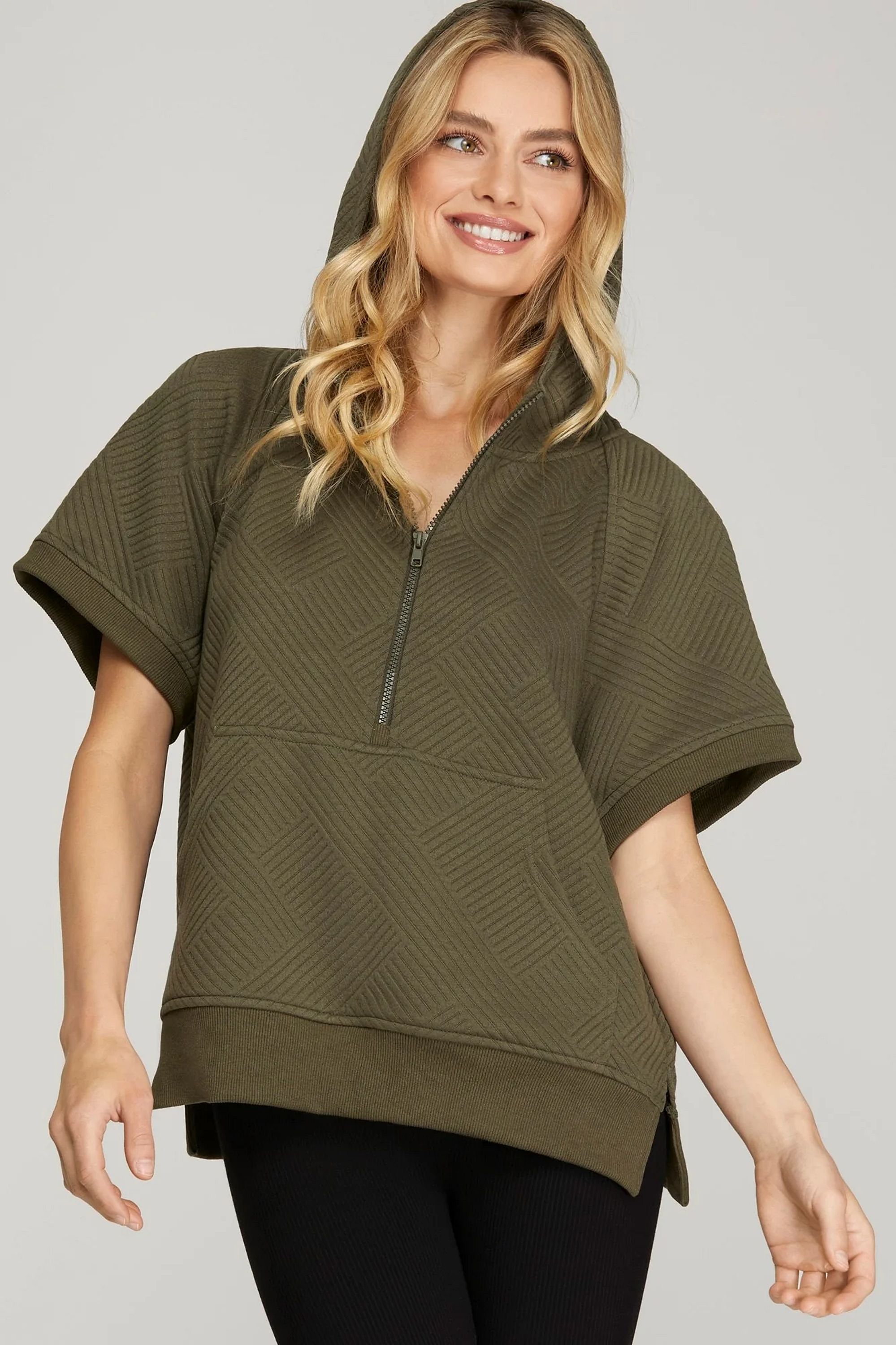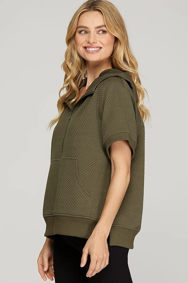 Half Zip Quilted Texture Hoodie Top - Olive - Small