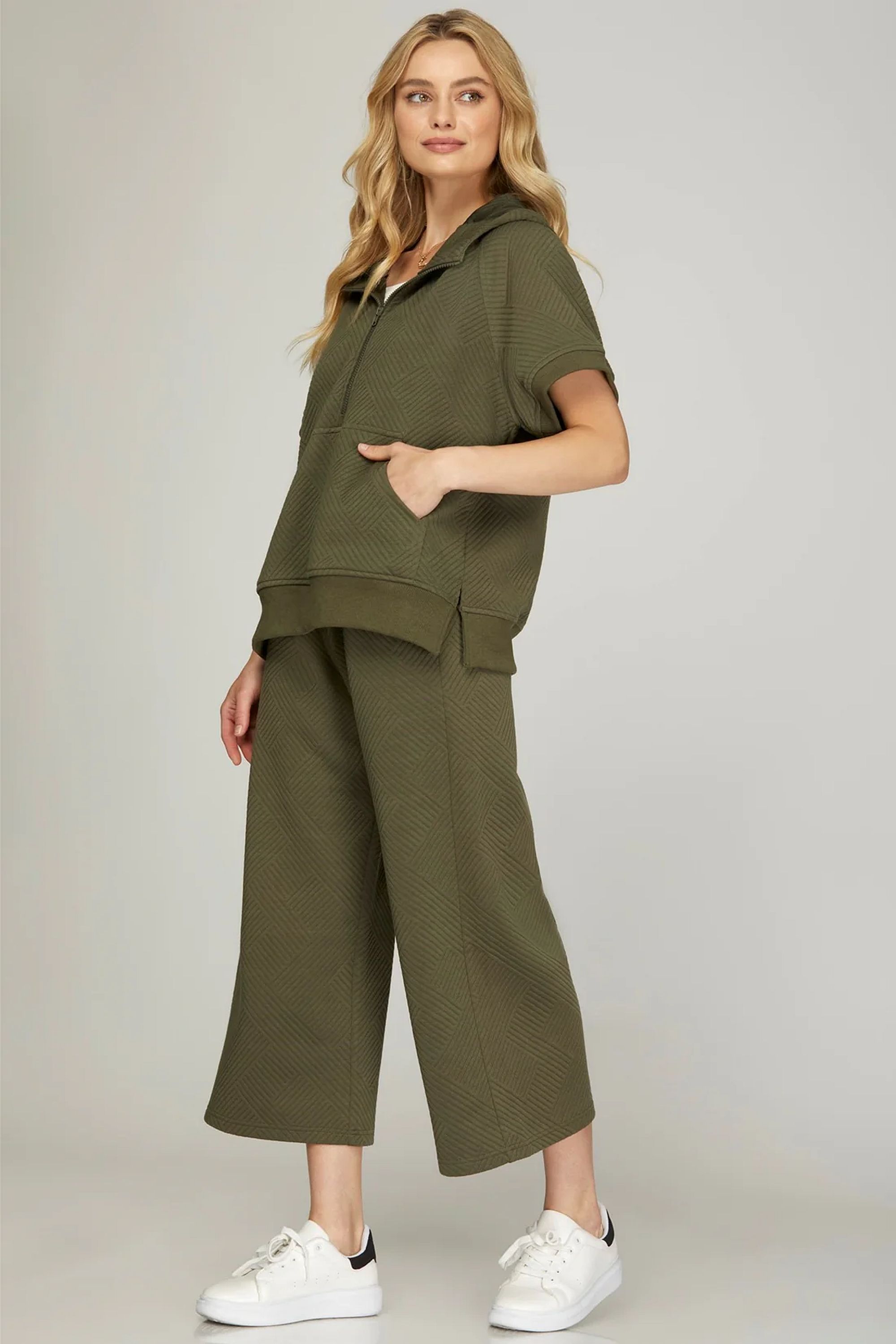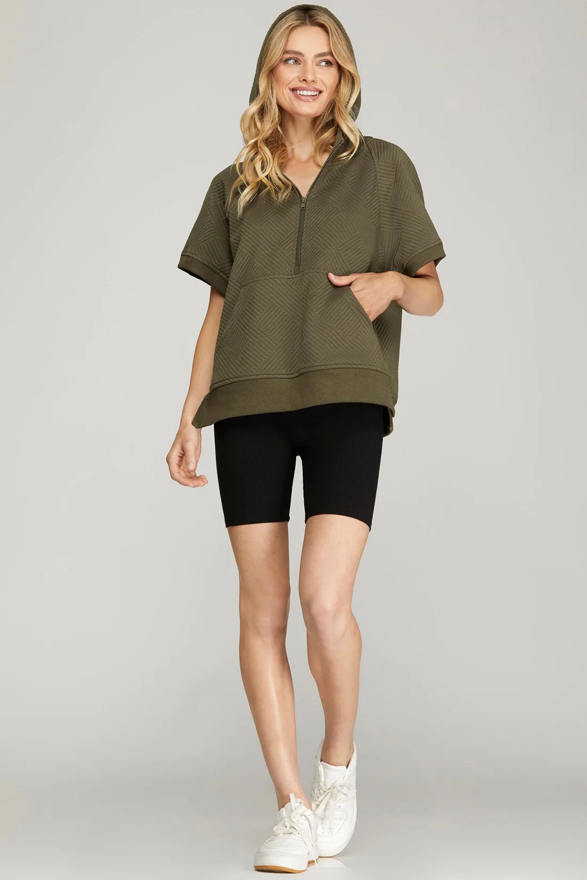 Half Zip Quilted Texture Hoodie Top - Olive