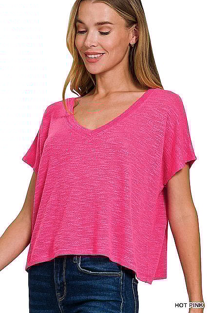 This V-neck Breezy Top is an easy, lightweight, and flattering relaxed fit with flowy short sleeves and a soft, breathable fabric. The pretty pink hue adds a fresh pop of color to your everyday wardrobe.
