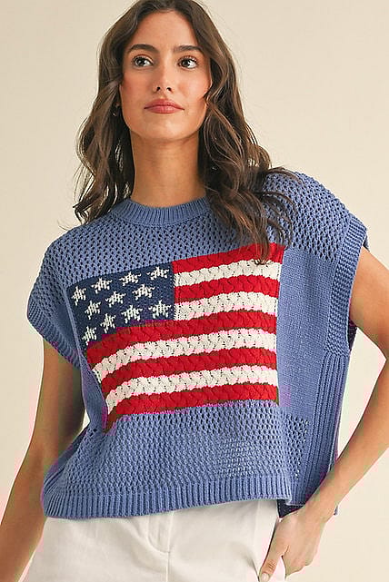 Show your patriotic side in style with this cozy yet lightweight sweater top featuring a vintage-inspired American flag design. With its relaxed fit, soft knit texture, and slightly cropped length, it's perfect for summer nights, lake days, or Fourth of July celebrations.