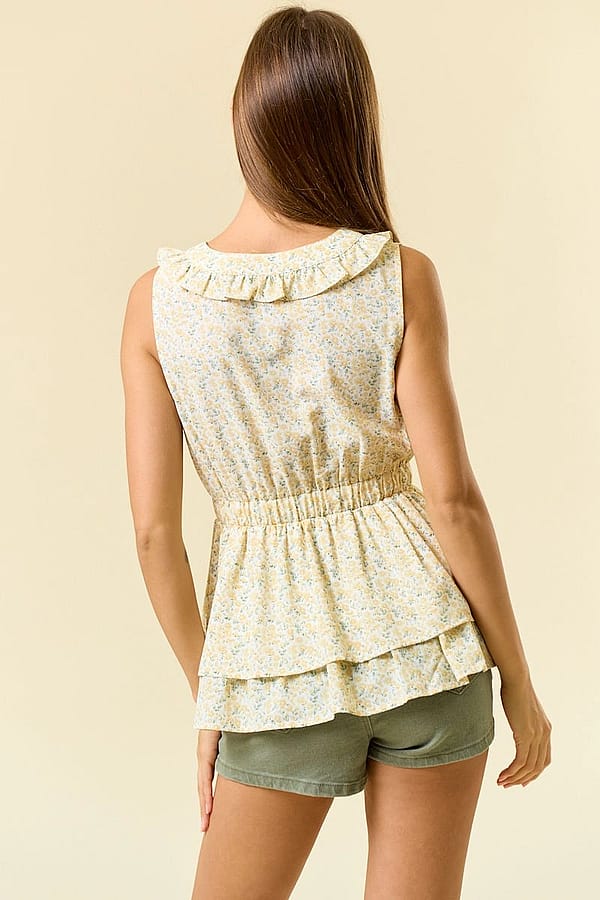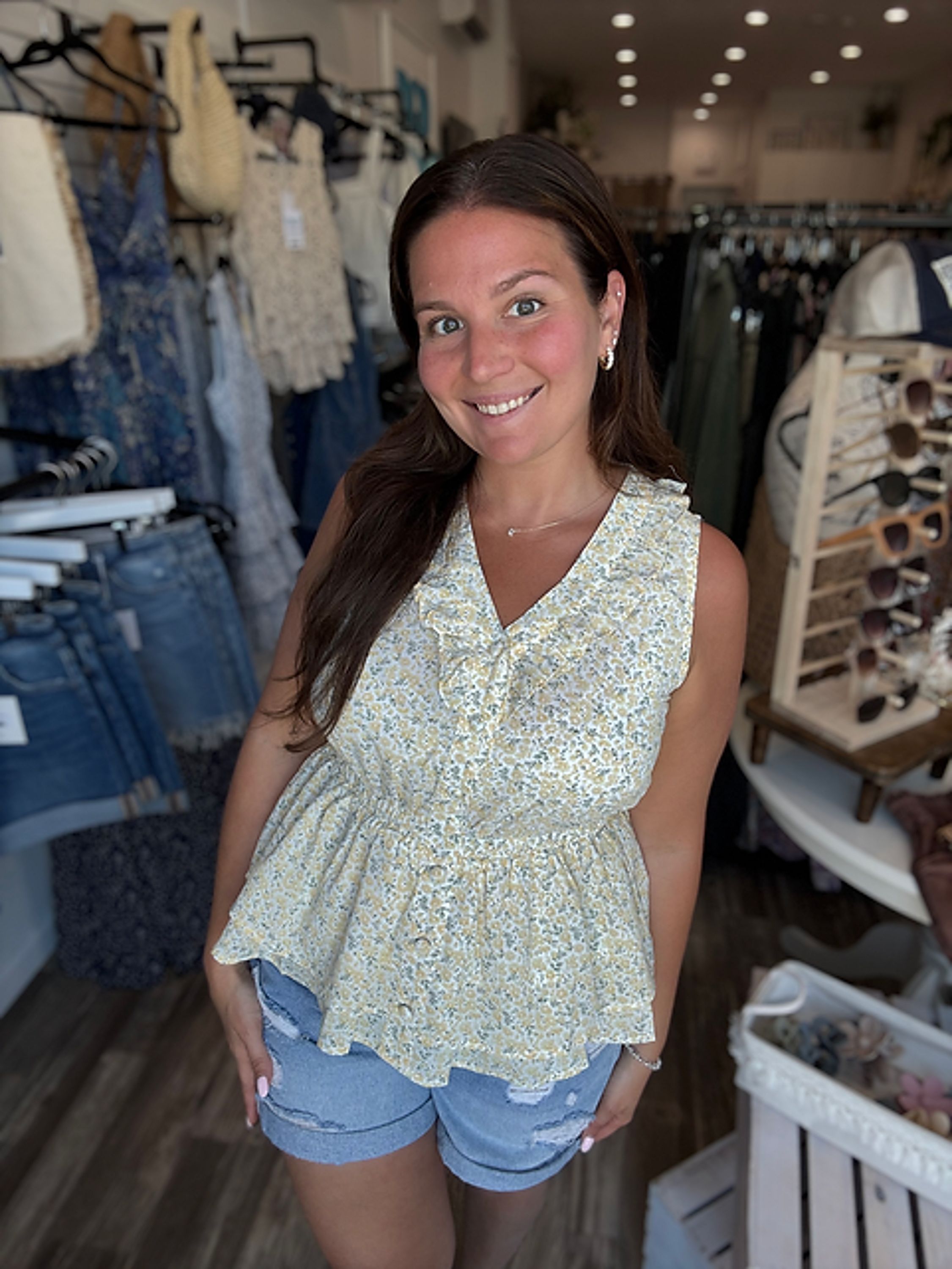 Soft, feminine, and full of sunshine—the Buttercream Peplum Top is made for easy days and feel-good outfits. The floral print and ruffled neckline add charm, while the cinched waist and layered hem create a flattering silhouette. Style it with denim, shorts, or wide-leg pants for a look that’s laid-back but lovely.