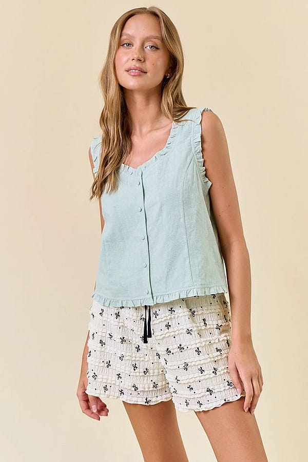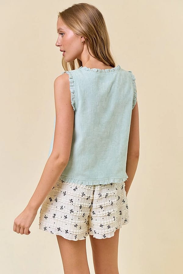 - Subtle ruffle trim along the neckline, sleeves, and hem