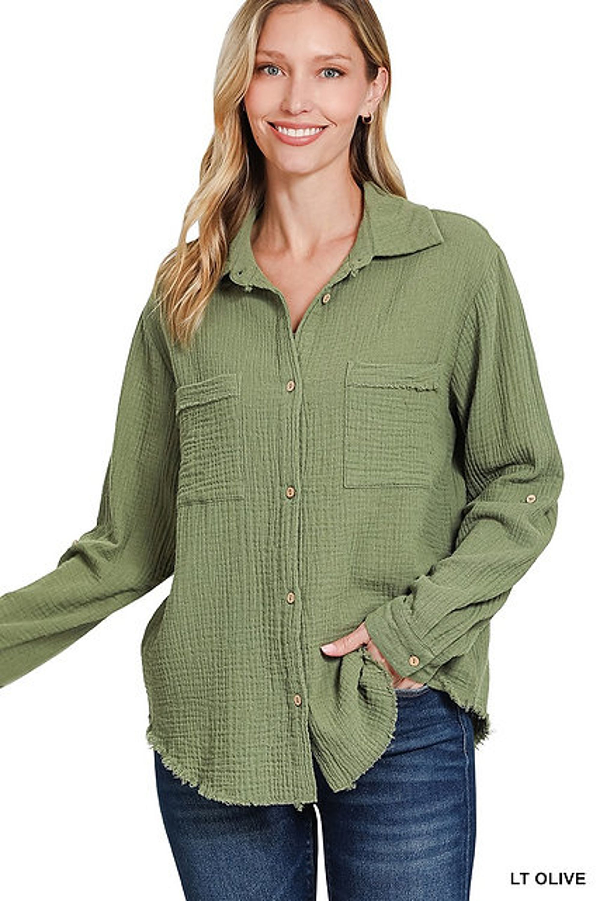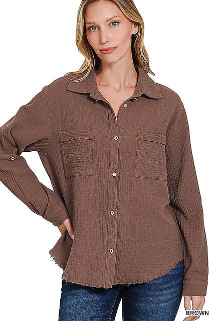 - Button-down front with raw edge detail
