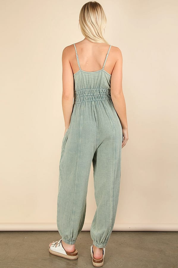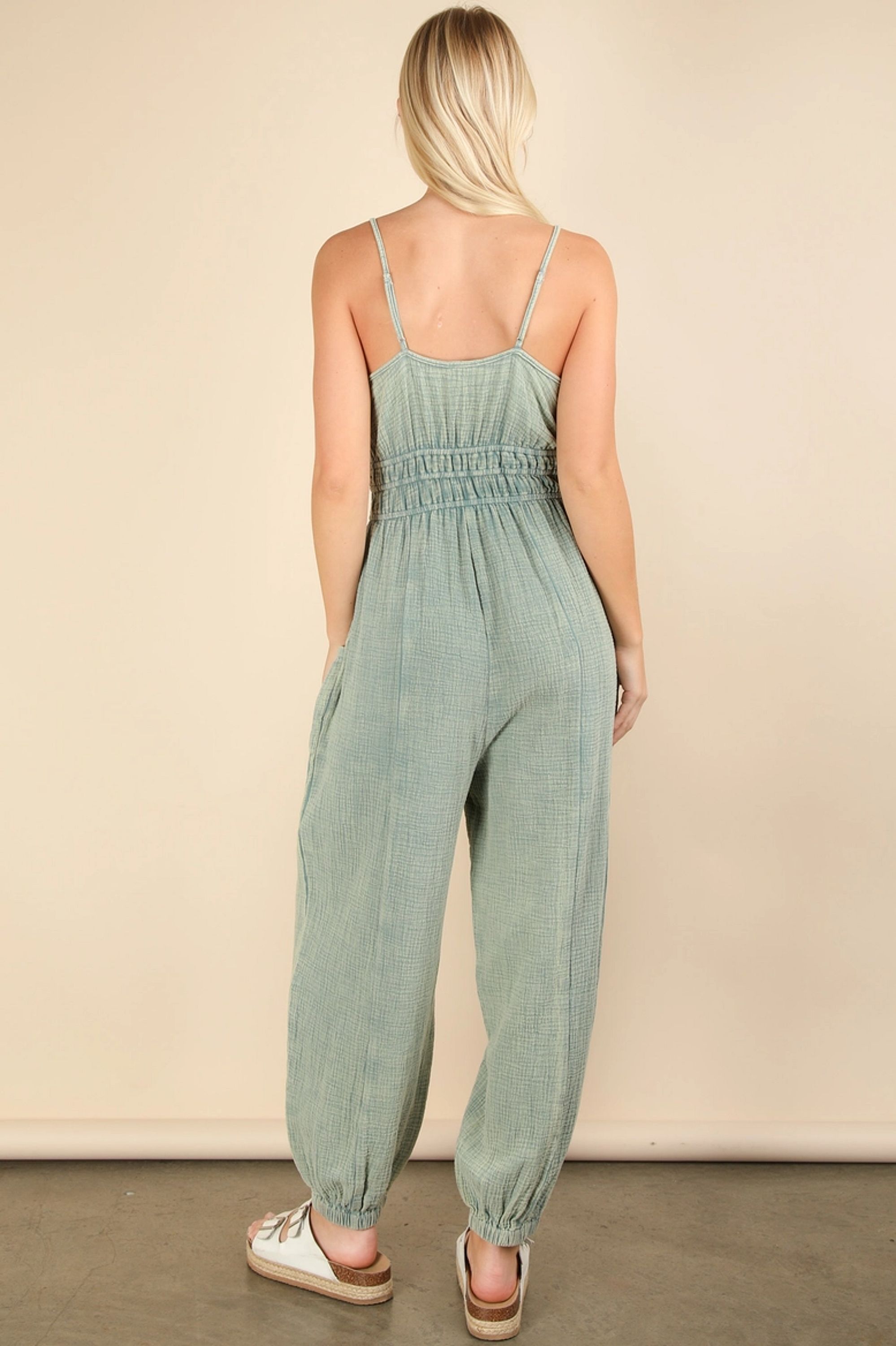 Turn heads in this bold and effortless one-piece. Featuring a vintage-style acid wash in a rich green hue, this jumpsuit offers a relaxed fit, adjustable straps, and handy side pockets. The soft, lived-in fabric makes it perfect for layering or wearing a solo for an edgy-casual vibe.
