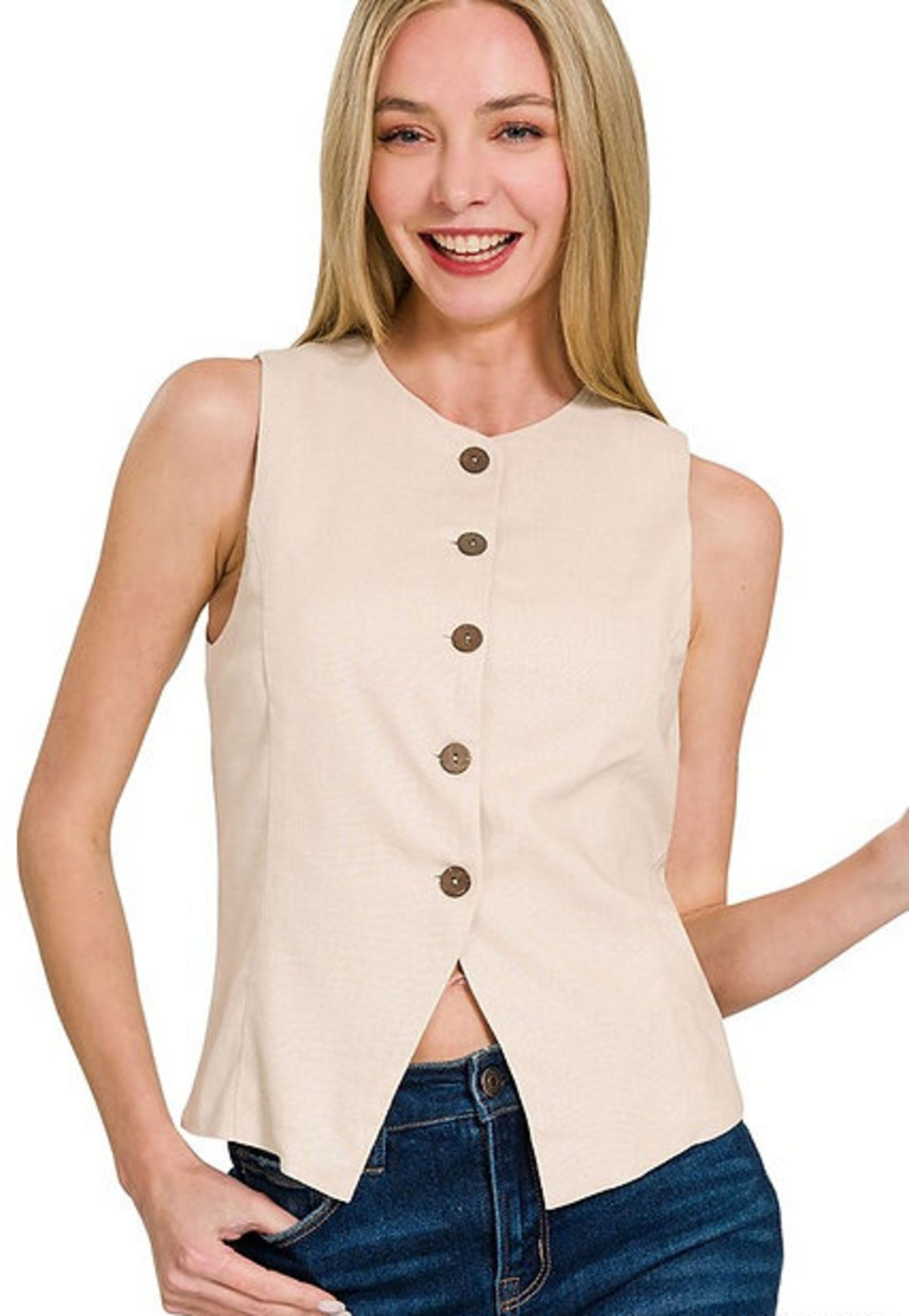 The Driftline Button Front Vest is where minimalist style meets warm-weather ease. With its structured silhouette and asymmetric button detail, it’s an effortless way to dress up denim or layer over a bralette for a cool, downtown look. Perfect for summer dinners, rooftop hangs, or elevating your everyday vibe.