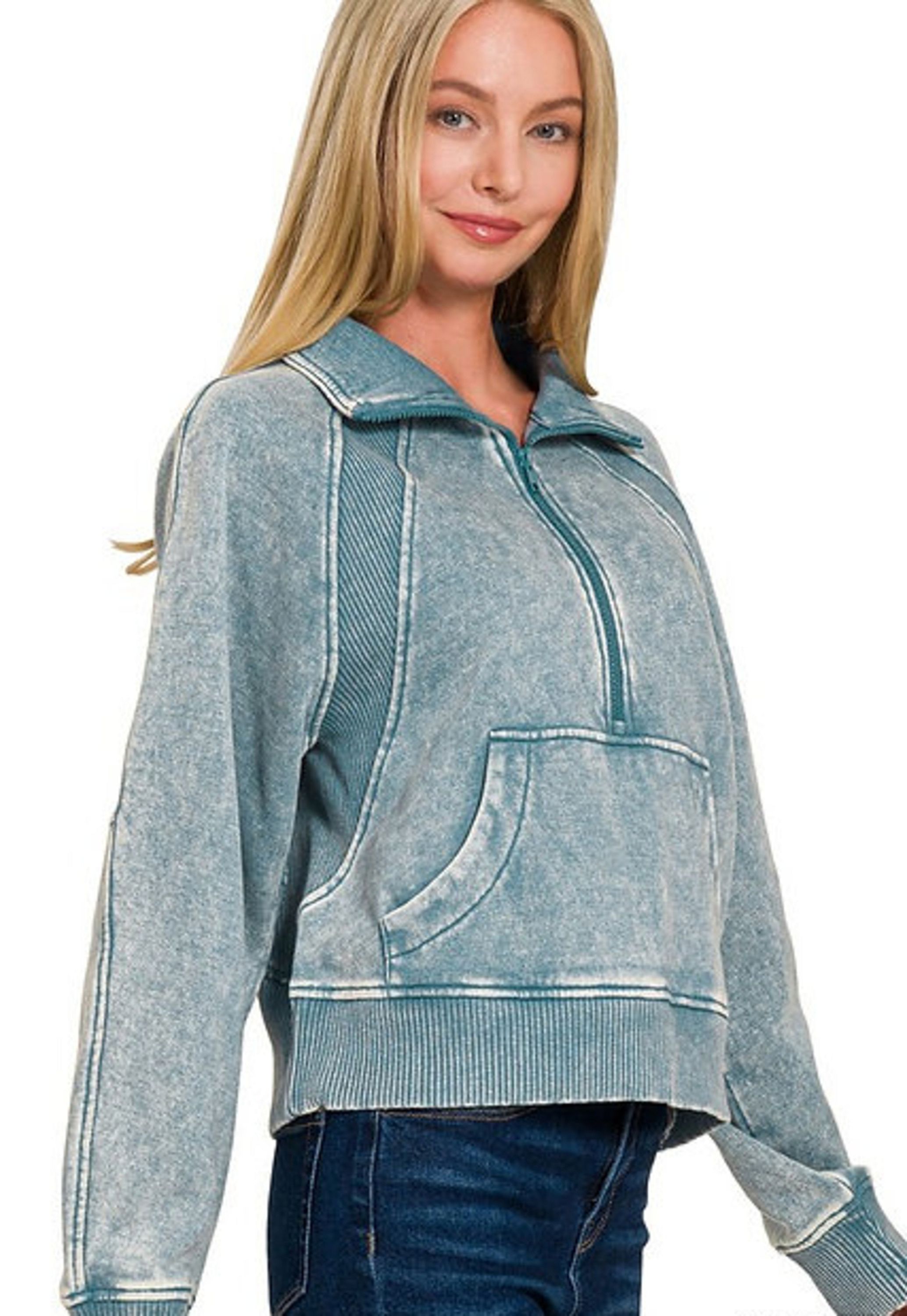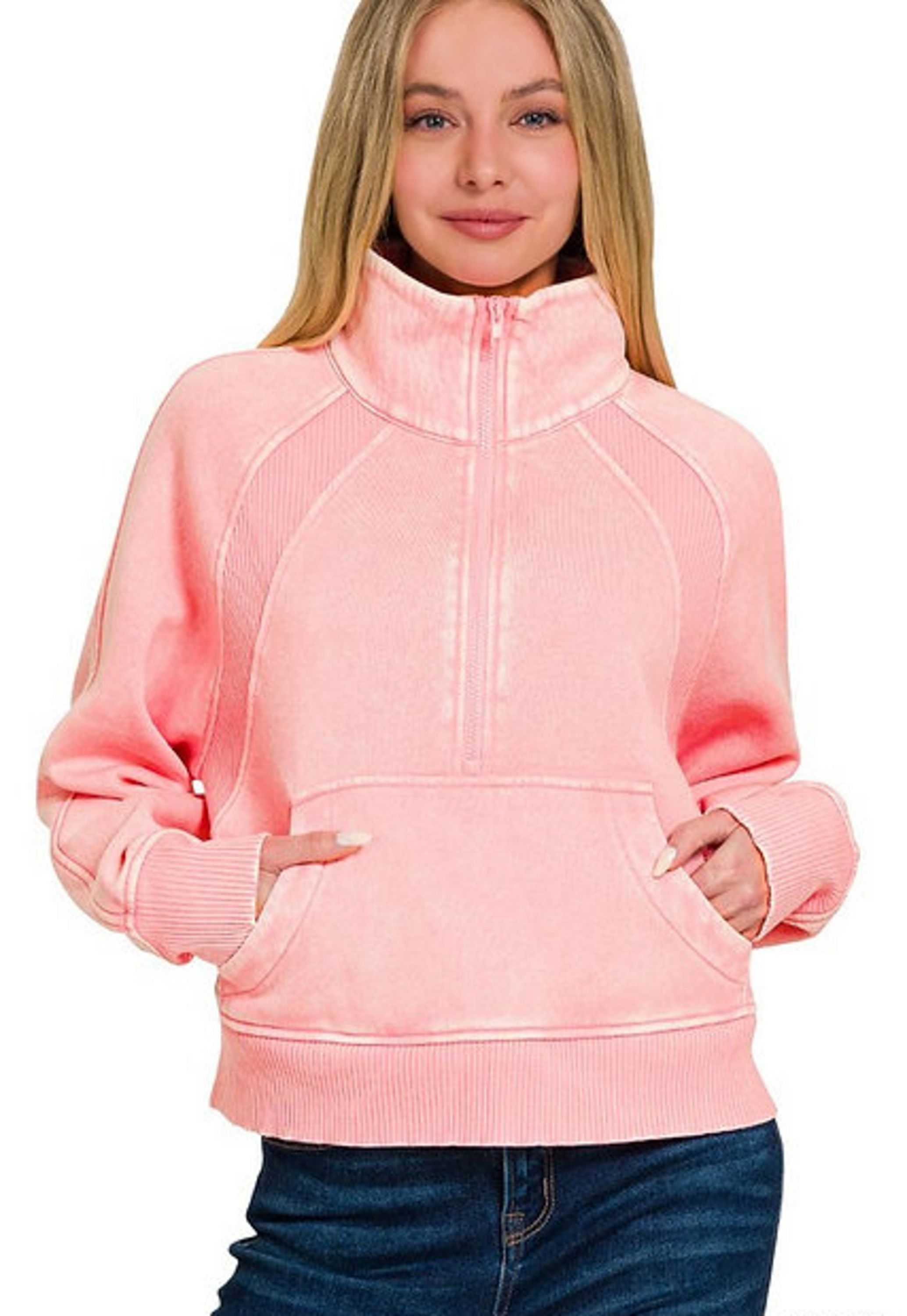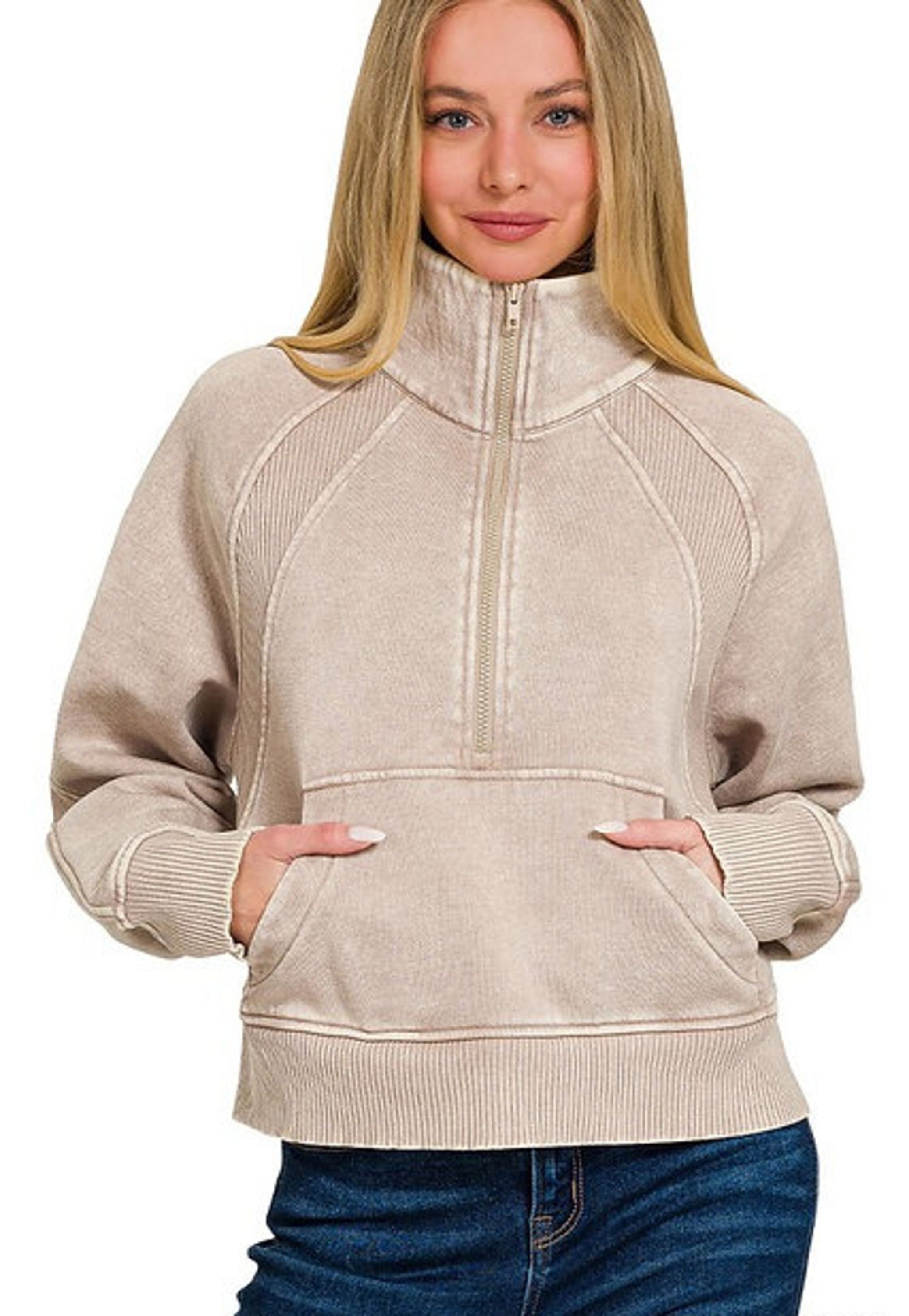 - Quarter zip with high funnel neck and kangaroo pocket