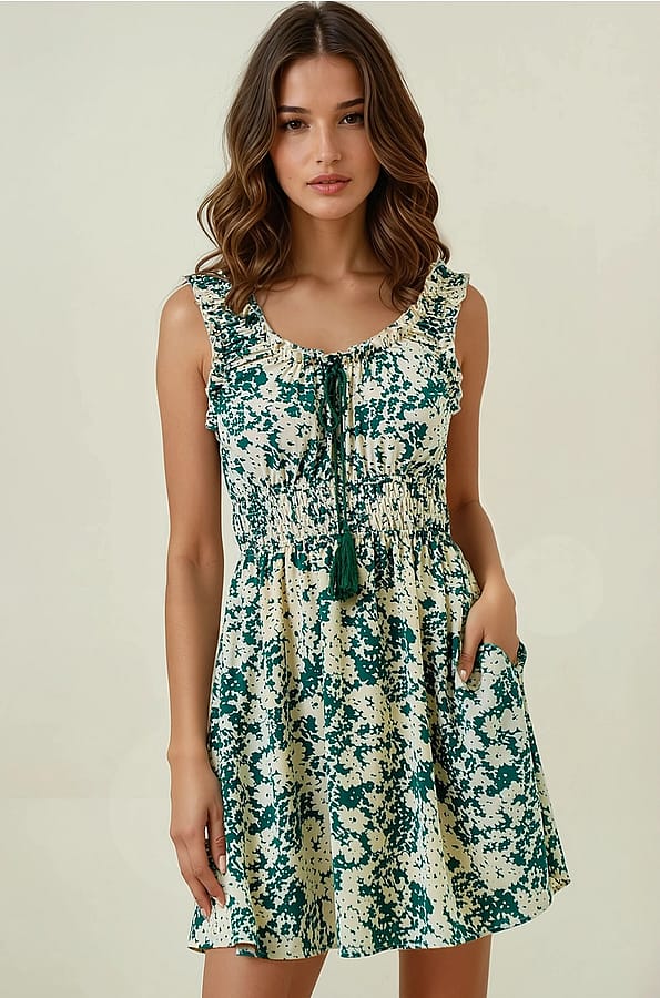The Sprinkled Forest Mini Dress is a playful, flattering piece you can wear now and love later. Its ruffled neckline, flowy shape, and adjustable waist make it perfect for weekend brunches, park dates, or layering with booties and a chunky sweater come fall. A total wear-on-repeat favorite.