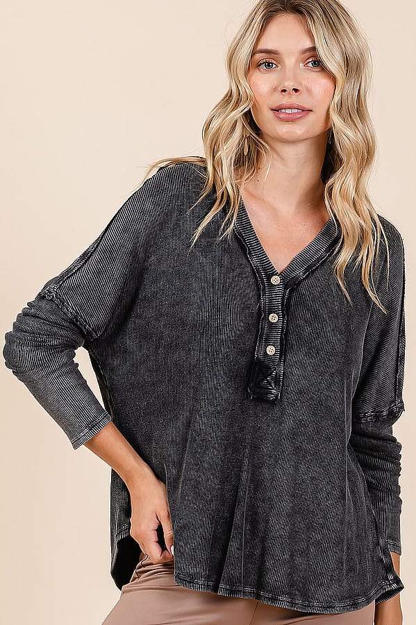 - Functional henley buttons and curved hem