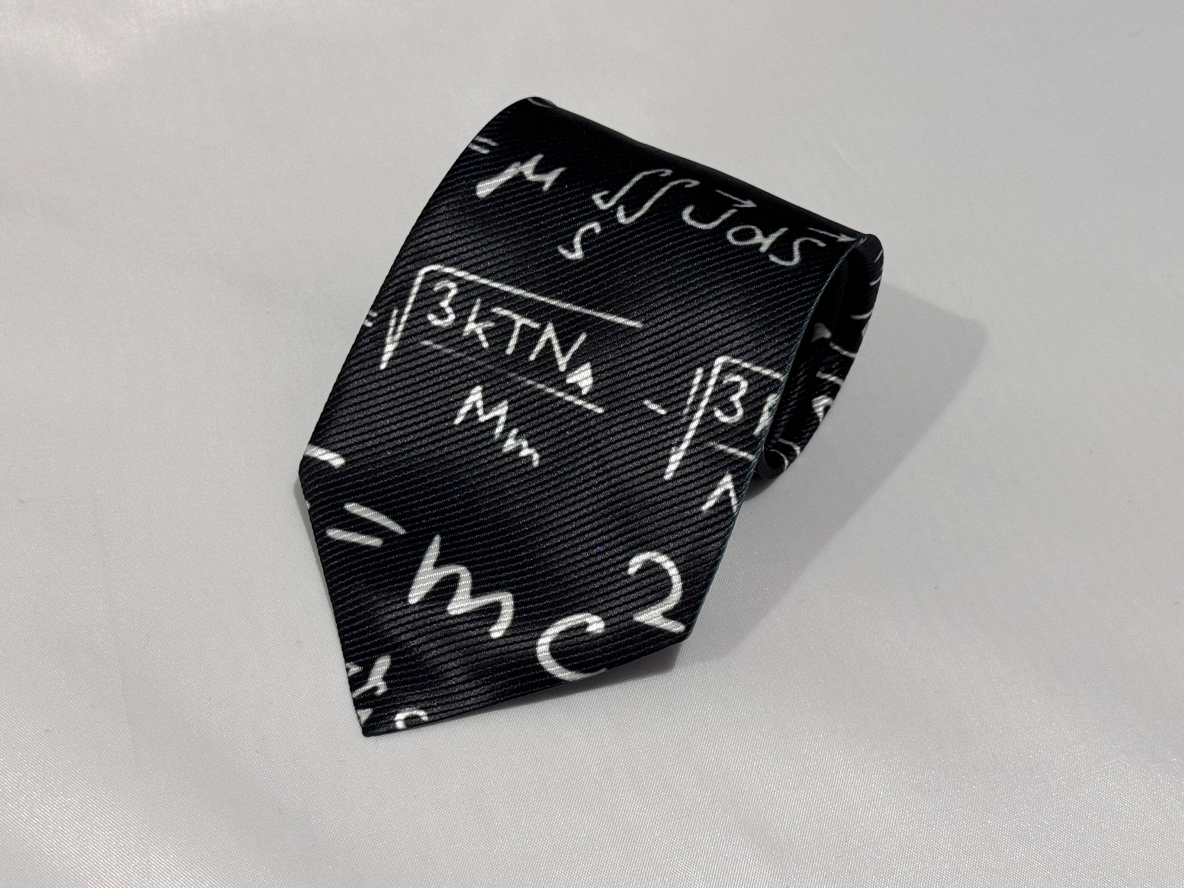 Design: The tie features a dynamic array of physics symbols and equations, including representations of mass-energy equivalence, and much more. The design is printed in contrasting colors on a sleek, dark background, creating a visually striking and intellectually stimulating pattern.