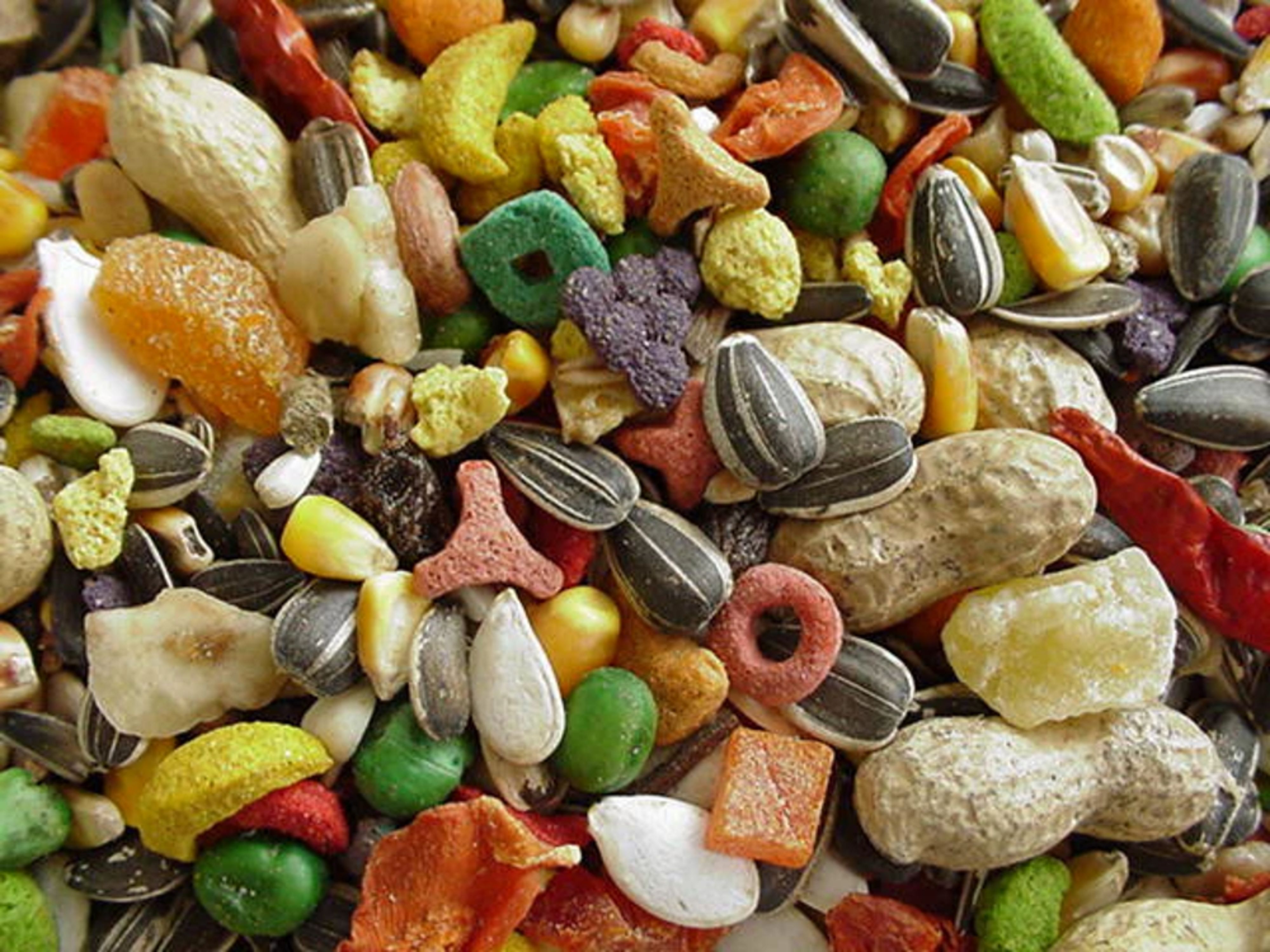 Ingredients: Sunflower Seeds, Peanuts, Corn, Oats Groats, Safflower Seeds, Pumpkin Seeds, Dehydrated Carrots, Dehydrated Peas, Fruit Pellets (Ground Corn, Ground Wheat, Ground Oat Groats, Dried Papaya, Dried Bananas, Soybean Meal, Dried Pineapple, Dried Coconut, Corn Gluten Meal, Dehydrated Apple, Almonds, Pistachios, Filberts, Whole Peanuts, Wheat Middlings, Ground Flax Seed, Soy Oil, Dried Mango, Dried Whole Egg, Dried Beet Pulp, Dicalcium Phosphate, Calcium Carbonate, Wheat Germ Meal, Corn Sugar, L-Lysine, Salt, Whole Cell Algae Meal (source of DHA), Fructooligosaccharide, Brewers Dried Yeast, Vitamin A Supplement, Choline Chloride, Dried Cane Molasses, Titanium Dioxide, Mixed Tocopherols (a preservative), Yeast Extract, DL-Methionine, Yucca Schidigera Extract, Propionic Acid (a preservative), Vitamin E Supplement, Vitamin B12 Supplement, Riboflavin Supplement, Manganese Proteinate, Copper Proteinate, Ferrous Sulfate, Zinc Oxide, Manganous Oxide, Menadione Sodium Bisulfite Complex (source of vitamin K activity), Niacin, Rosemary Extract, Citric Acid, Calcium Pantothenate, L-Carnitine, Copper Sulfate, Thiamine Mononitrate, Pyridoxine Hydrochloride, Cholecalciferol (source of vitamin D3), Beta-Carotene, Canthaxanthin, Folic Acid, Calcium Iodate, Biotin, Cobalt Carbonate, Sodium Selenite, Dried Bacillus subtilis Fermentation Product, Dried Bacillus licheniformis Fermentation Product, Artificial Colors, Natural Flavors), Peppers, Banana Chips, Spinach, Diced Papaya, Diced Pineapples, Raisins, Cranberries, Apricots, Walnuts, Apple Rings, Almonds, Coconut Flakes, Sweet Potato Spears, Yogurt Drops, Tri Colored Pasta and Natural Orange Flavor