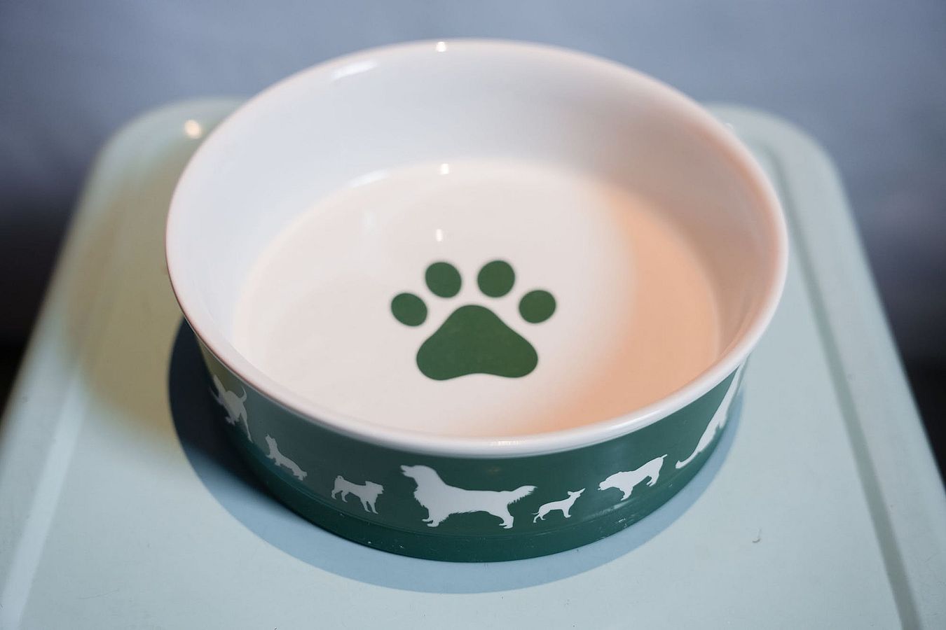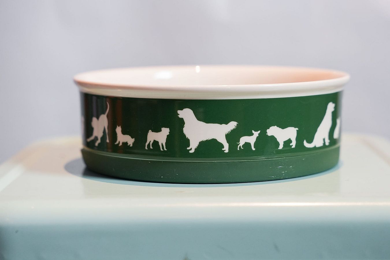 A charming pet bowl featuring playful white dog silhouettes encircling the outside against a deep green background. Crafted from durable, food-safe ceramic, it's BPA-free, features a non-skid silicone base to prevent sliding, and is both dishwasher- and microwave-safe for easy cleaning. Perfect for serving pet's food or water in style.