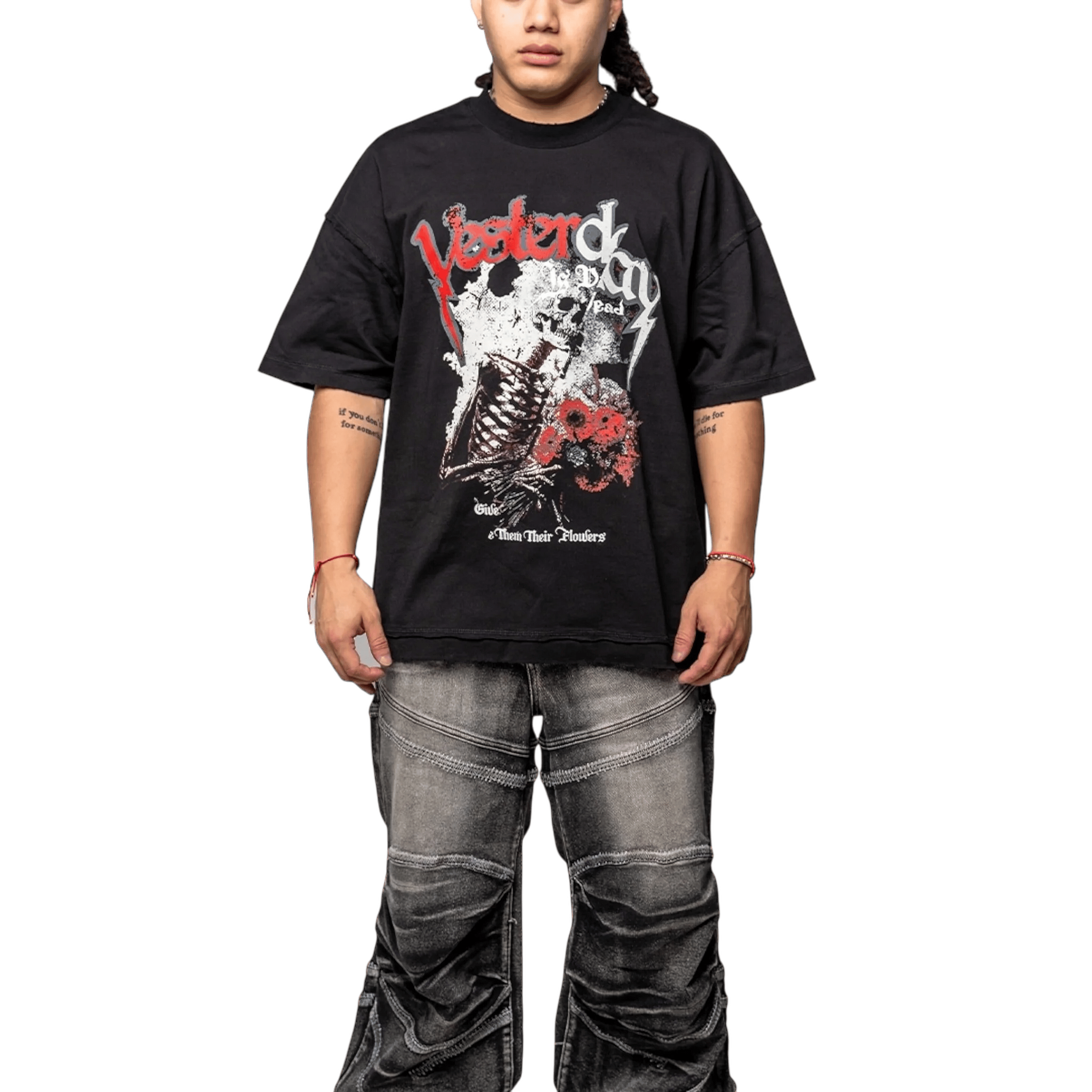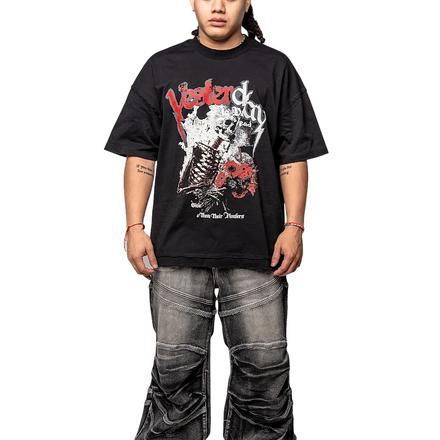 Premium Fabric: Made from 100% cotton, offering a soft yet durable feel with breathable comfort. Oversized Fit: A relaxed, dropped-shoulder silhouette provides a laid-back and effortless streetwear aesthetic. Front Graphic Print: Features the phrase “Yesterday is Dead” in a distressed, lightning-infused font. A detailed illustration of a skeletal hand gripping a bouquet of red flowers symbolizes the theme of remembrance and appreciation. The phrase "Give Them Their Flowers" at the bottom emphasizes the message behind the design. High-Quality Screen Print: Ensures vibrant colors and durability, preventing fading and cracking over time.