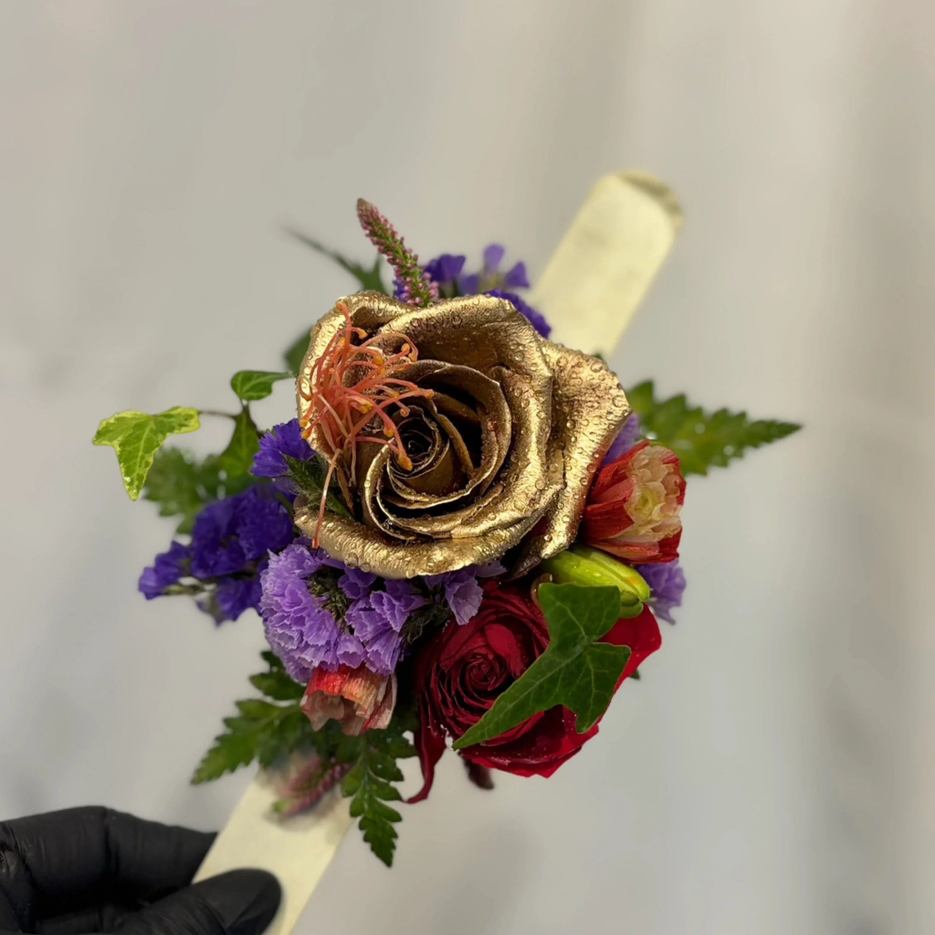 Crafted for moments that deserve to stand out. Golden Hour features a hand-painted gold rose at its center — a symbol of opulence and bold beauty — accented by deep crimson blooms, violet statice, and lush greenery. Designed with dramatic flair and premium florals, this wrist corsage is perfect for upscale events where every detail matters.