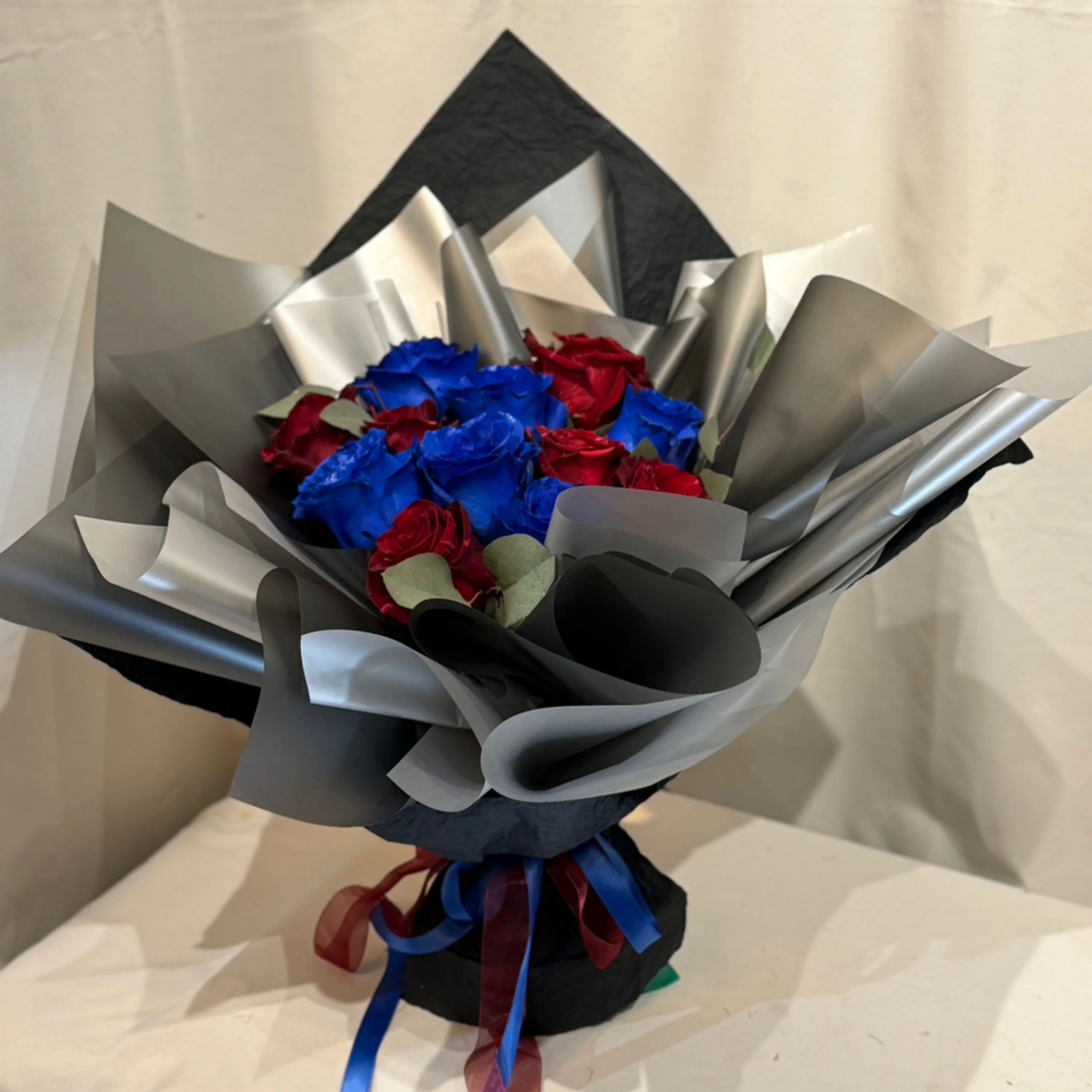 A striking bouquet of vivid dyed blue and classic red roses, wrapped in layered black and silver tones. Designed to capture contrast, tension, and quiet strength in a single, sculptural form.