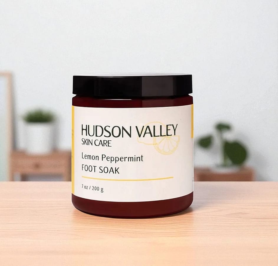 Lemon Peppermint Foot Soak from Hudson Valley Skin Care – Made in the heart of New York, this revitalizing soak soothes tired feet with a refreshing blend of citrus and mint, perfect for an at-home spa experience.