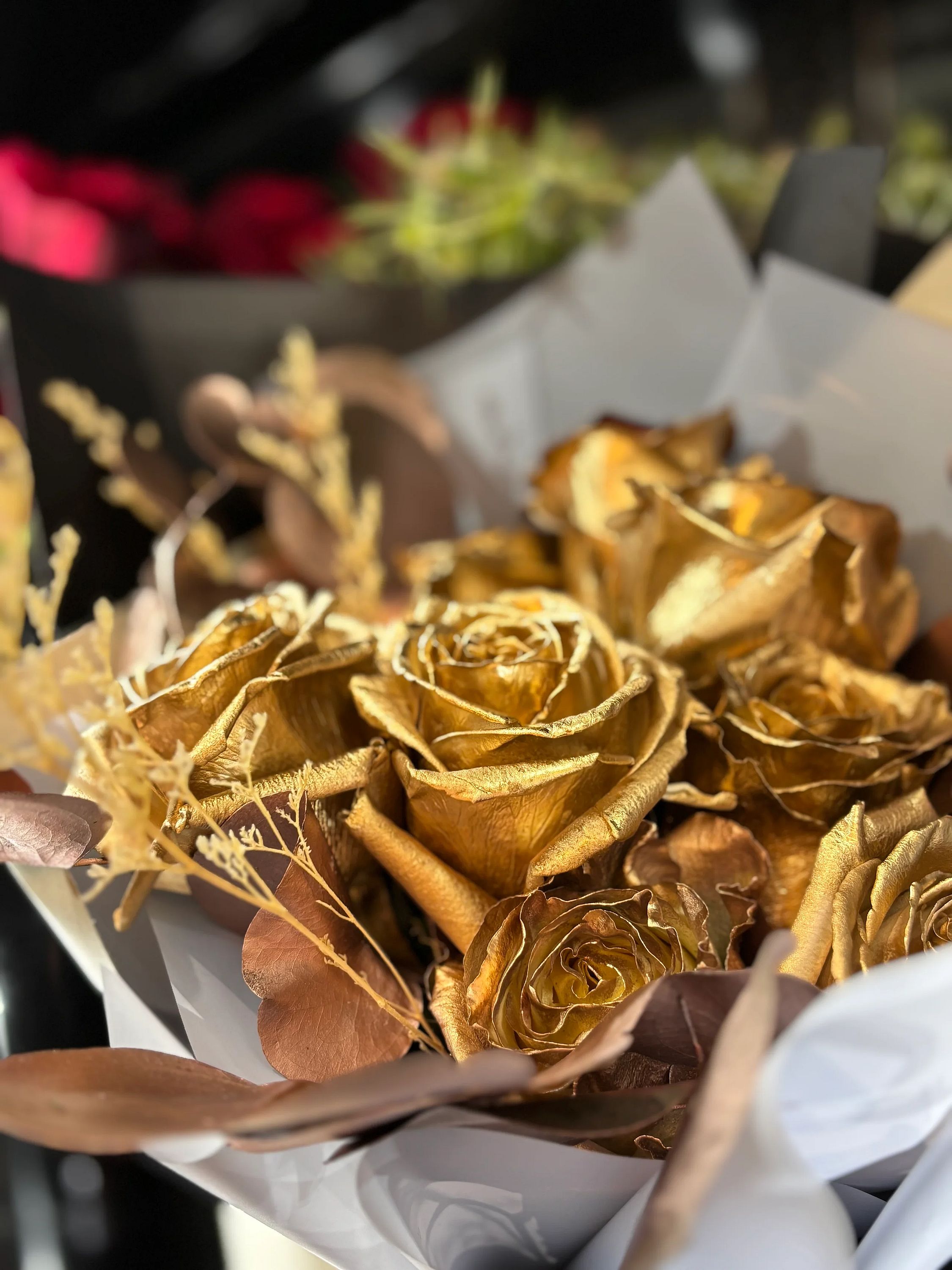Golden roses and rose gold eucalyptus—elegant, radiant, and unforgettable. This bouquet feels like a gift from a private collection: rich in tone, refined in every detail.